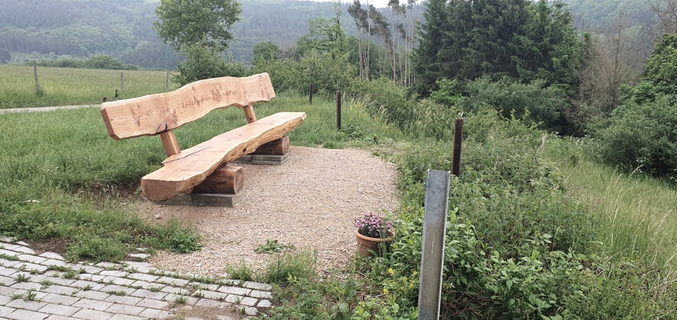Herrliche Fernsicht von der gemütlichen Panoramabank oberhalb vom beschaulichen Eifeldorf Müsch an der Ahr.