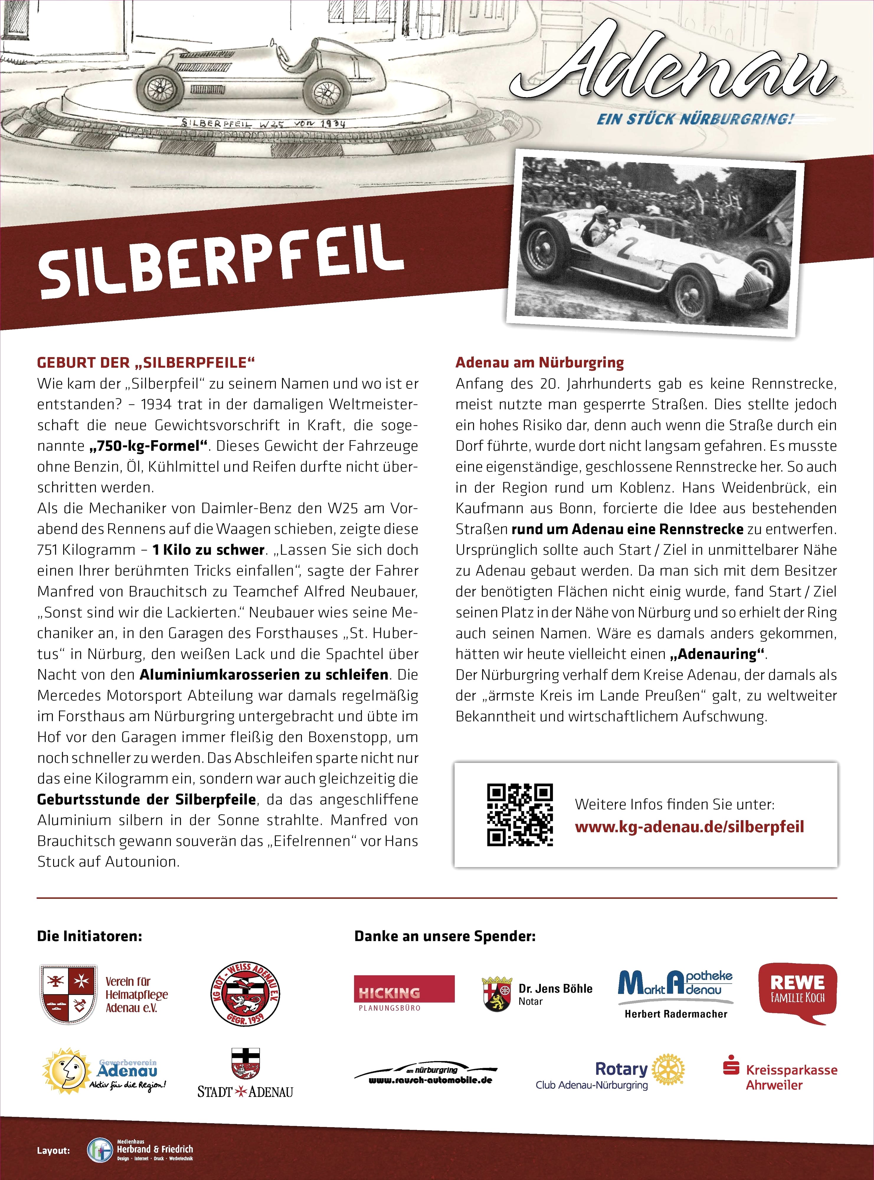 Neubauer wies seine Mechaniker an, in den Garagen des Forsthauses „St. Hubertus“ in Nürburg, den weißen Lack und die Spachtel über Nacht von den Aluminiumkarosserien zu schleifen. Die Mercedes Motorsport Abteilung war damals regelmäßig im Forsthaus am Nürburgring untergebracht und übte im Hof vor den Garagen immer fleißig den Boxenstopp, um noch schneller zu werden. Das Abschleifen sparte nicht nur das eine Kilogramm ein, sondern war auch gleichzeitig die Geburtsstunde der Silberpfeile, da das angeschliffene Aluminium silbern in der Sonne strahlte. Manfred von Brauchitsch gewann souverän das „Eifelrennen“ vor Hans Stuck auf Autounion. Adenau am Nürburgring Anfang des 20. Jahrhunderts gab es keine Rennstrecke, meist nutzte man gesperrte Straßen. Dies stellte jedoch ein hohes Risiko dar, denn auch wenn die Straße durch ein Dorf führte, wurde dort nicht langsam gefahren. Es musste eine eigenständige, geschlossene Rennstrecke her. So auch in der Region rund um Koblenz. Hanns Weidenbrück, ein Kaufmann aus Bonn, forcierte die Idee aus bestehenden Straßen rund um Adenau eine Rennstrecke zu entwerfen. Ursprünglich sollte auch Start / Ziel in unmittelbarer Nähe zu Adenau gebaut werden. Da man sich mit dem Besitzer der benötigten Flächen nicht einig wurde, fand Start / Ziel seinen Platz in der Nähe von Nürburg und so erhielt der Ring auch seinen Namen. Wäre es damals anders gekommen, hätten wir heute vielleicht einen „Adenauring“. Der Nürburgring verhalf dem Kreise Adenau, der damals als der „ärmste Kreis im Lande Preußen“ galt, zu weltweiter Bekanntheit und wirtschaftlichem Aufschwung.