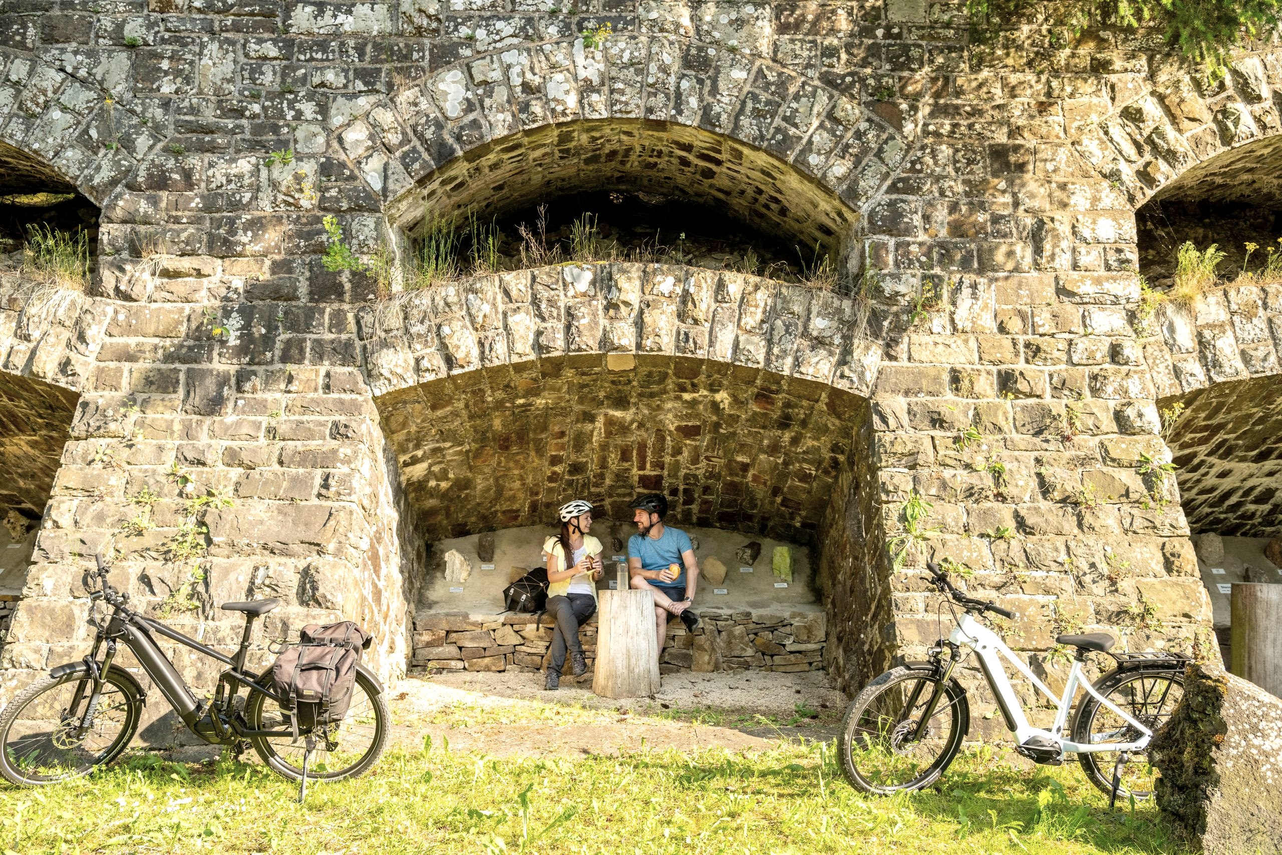 This unusual seating area in the niches of an old retaining wall makes you want to take a leisurely break right on the Ahr Cycle Path.