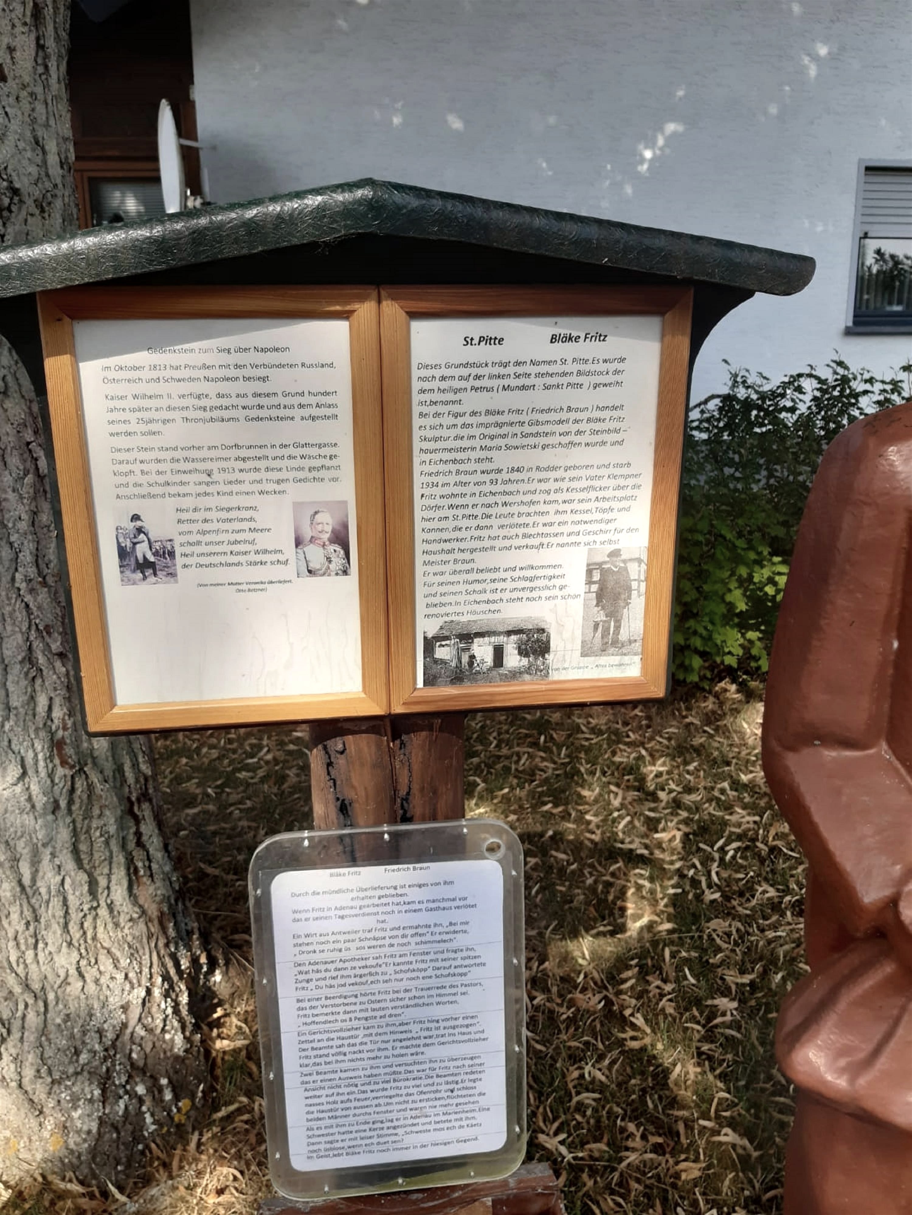 Place with contemporary witnesses of Wershofen's history. At the rest area on Dreisbachstraße there is a plaster replica of the Eifel Kesselflicker Bläke Fritz. The original sandstone sculpture by master sculptor Mia Sowietzki is in Eichenbach.