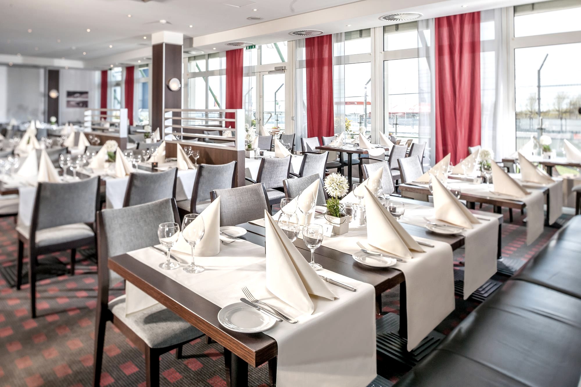 Add appealing social programmes make your conference a unique event. 207 rooms (divided into standard and comfort, suites and 1 wheelchair accessible room) The comfort rooms and suites have a private balcony with a direct view of the racetrack. The restaurant "Fascination" has 200 seats, the outdoor terrace in front of it 80, the unique cockpit bar 70 and the Dorint "Wies'n" in front of the hotel 60 seats. 333m² modern fitness area, steam bath and sauna 120 hotel-owned underground parking spots and charging stations for electric cars