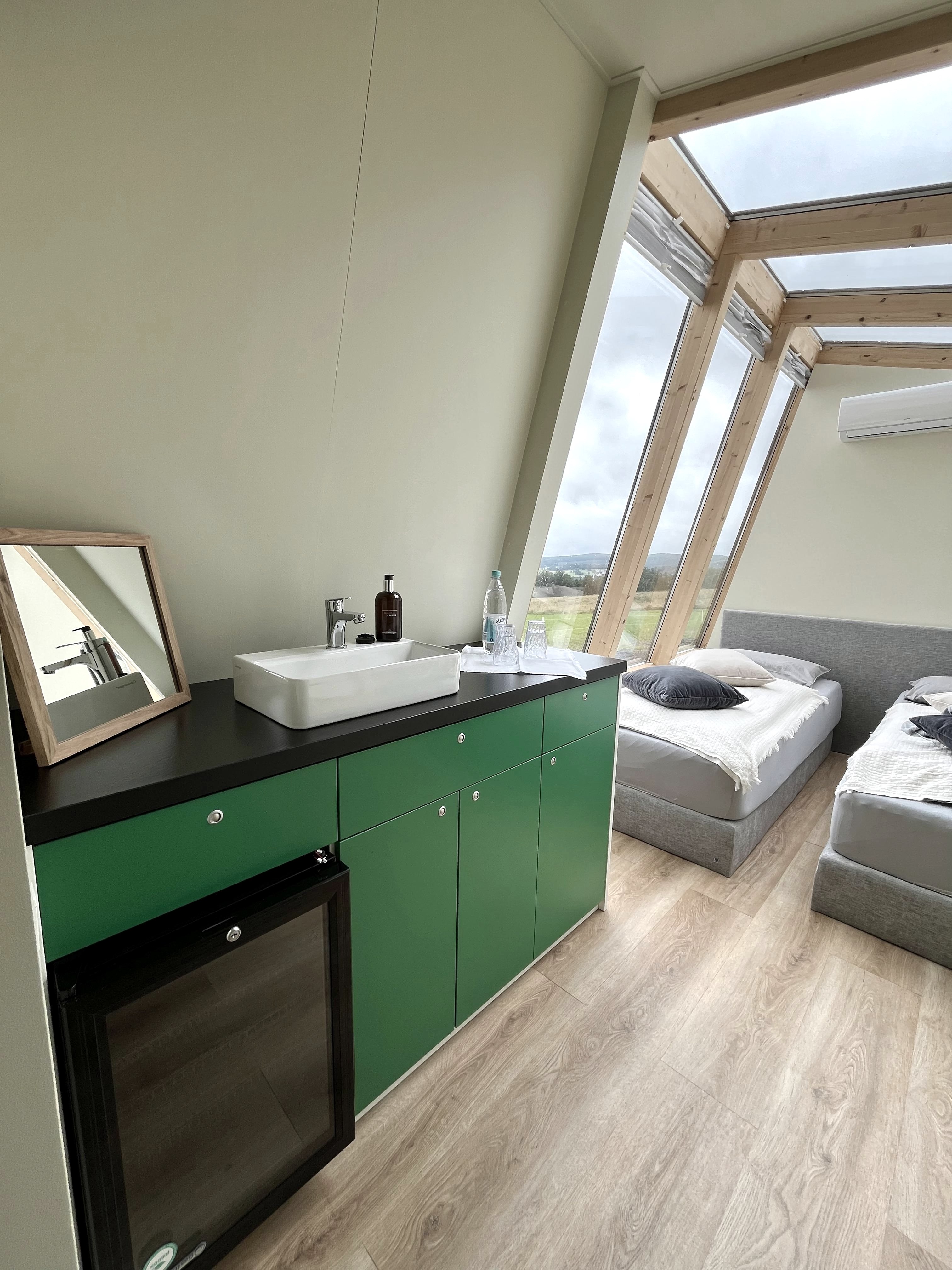 This charming wooden Tiny House impresses with its environmentally friendly construction and modern furnishings. On an area of 20m², it offers a cozy and functional home. The Tiny House is located in the immediate vicinity of the Nürburgring and is therefore perfect for motorsport enthusiasts and nature lovers alike. It is located on an agricultural estate that offers an idyllic and peaceful setting. Thanks to large windows, the Tiny House is flooded with light and offers a breathtaking view of up to 25 kilometers.