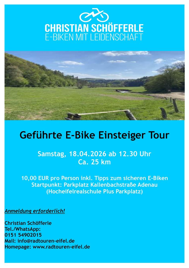 Anmeldung: Christian Schöfferle Tel./WhatsApp: 0151 54902015 Mail: info@radtouren-eifel.de