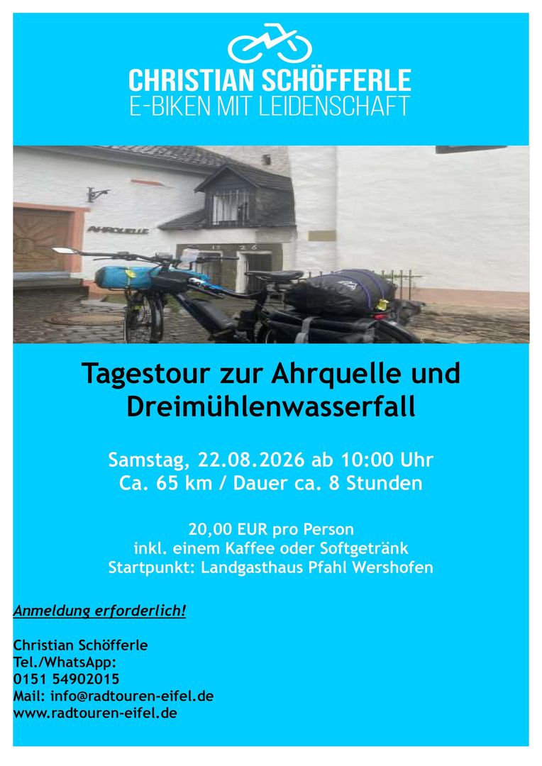 Geführte Tagestour von Wershofen zur Ahrquelle und zum Wasserfall Dreimühlen nach Nohn. Diese Tagestour ist für jeden normal konditionierten Radler kein Problem. Die Tour hat eine Länge von ca. 65 km und dauert ca. 8 Stunden. In der Nähe des Wasserfalls gibt es ein kleines Café, mit Einkehr. Nach der Pause und Besichtigung des Wasserfalls, geht es wieder nach Wershofen zurück. Im Preis von 20,-- Euro pro Person ist ein Kaffee oder ein Softgetränk enthalten. Eine Anmeldung ist erforderlich.