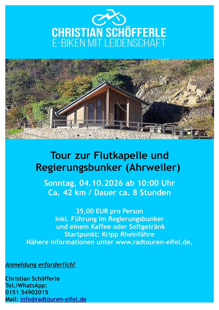 Anmeldung: Christian Schöfferle Tel./WhatsApp: 0151 54902015 Mail: info@radtouren-eifel.de