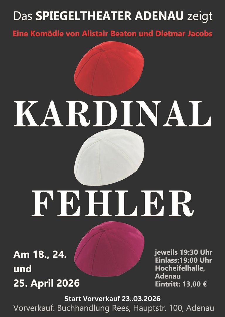 Mit dem Stück „Kardinalfehler“ von Alistair Beaton und Dietmar Jacobs laden sie das Publikum zu einem unterhaltsamen Theaterabend ein. Mit viel Herzblut, Spielfreude und frischem Elan hat sich die Gruppe wieder zusammengefunden und freut sich darauf, ihre Gäste wieder in der Hocheifelhalle begrüßen und unterhalten zu dürfen.