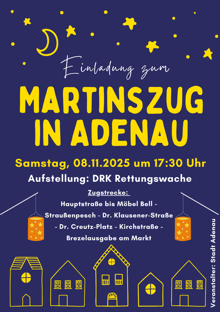 Der traditionelle Martinszug startet am Samstag um 17.30 Uhr an der DRK-Rettungswache. St. Martin auf seinem Pferd wird von vielen Kindern und Familien und bunt geschmückten Laternen durch die Straßen von Adenau begleitet. Die Kinder können sich natürlich auf einen leckeren "Weckmann" freuen.