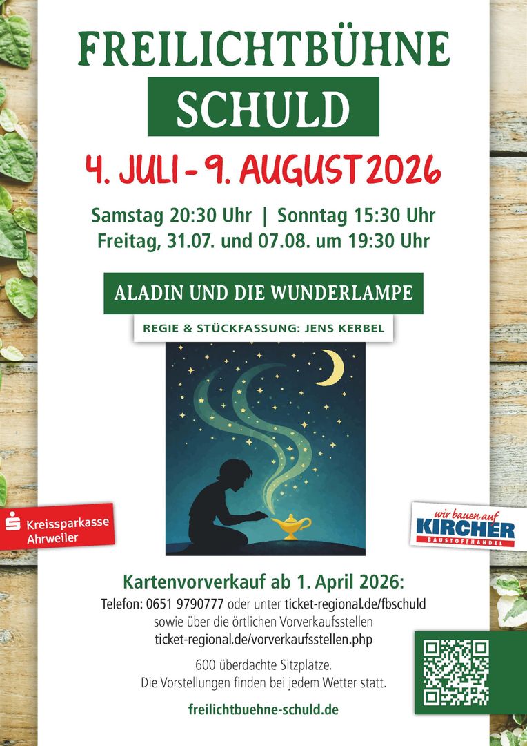 Mitten im Grünen, umgeben von der natürlichen Kulisse des Waldes, lädt die Freilichtbühne in Schuld zu einem besonderen Theatererlebnis ein. Auf dem Programm steht "Aladin und die Wunderlampe " ein Theaterstück, das Jung und Alt gleichermaßen begeistert. Die Aufführung dauert etwa 90 Minuten und beinhaltet eine Pause – ideal, um die Atmosphäre zu genießen und sich mit einem kleinen Snack zu stärken.