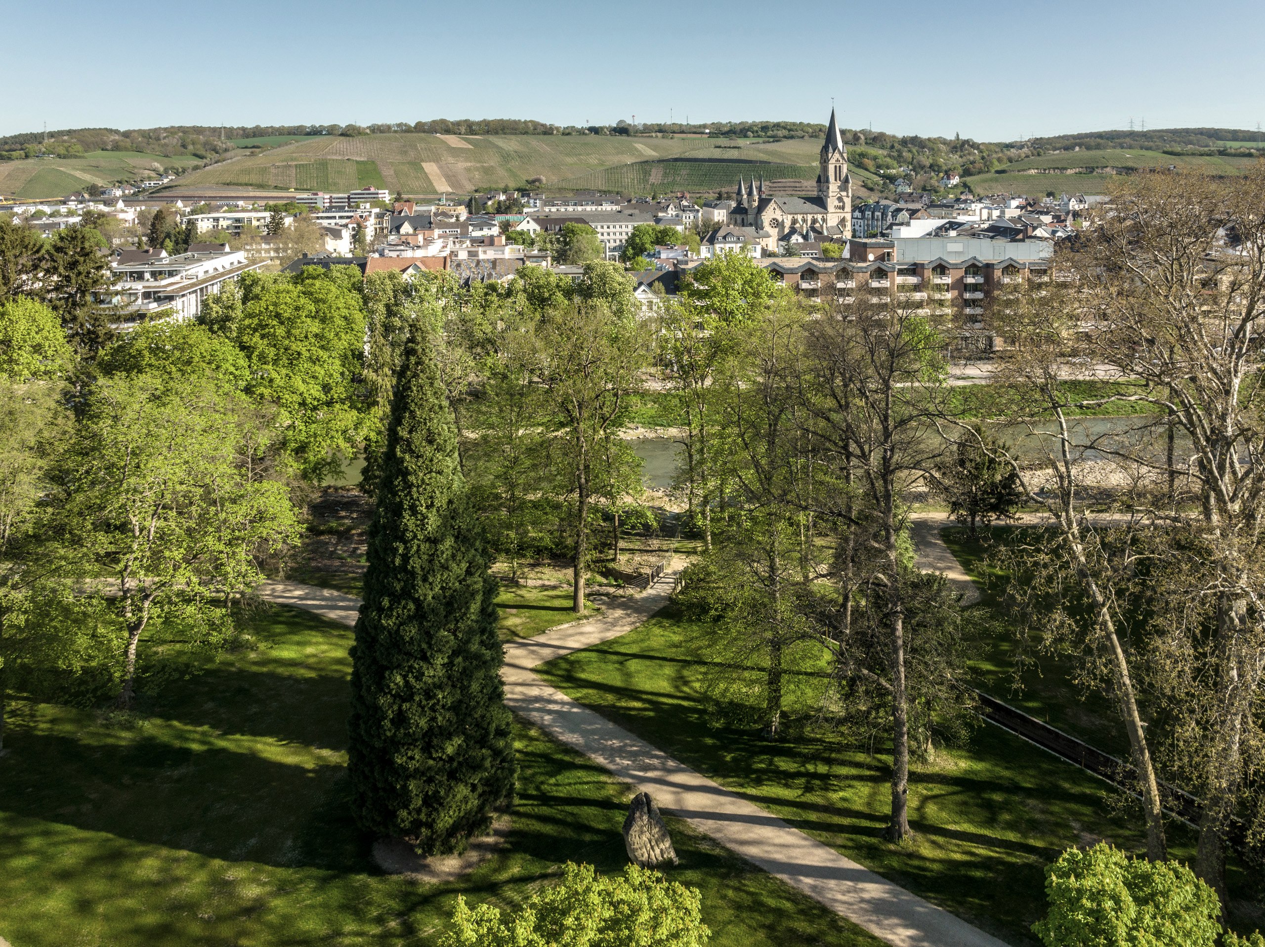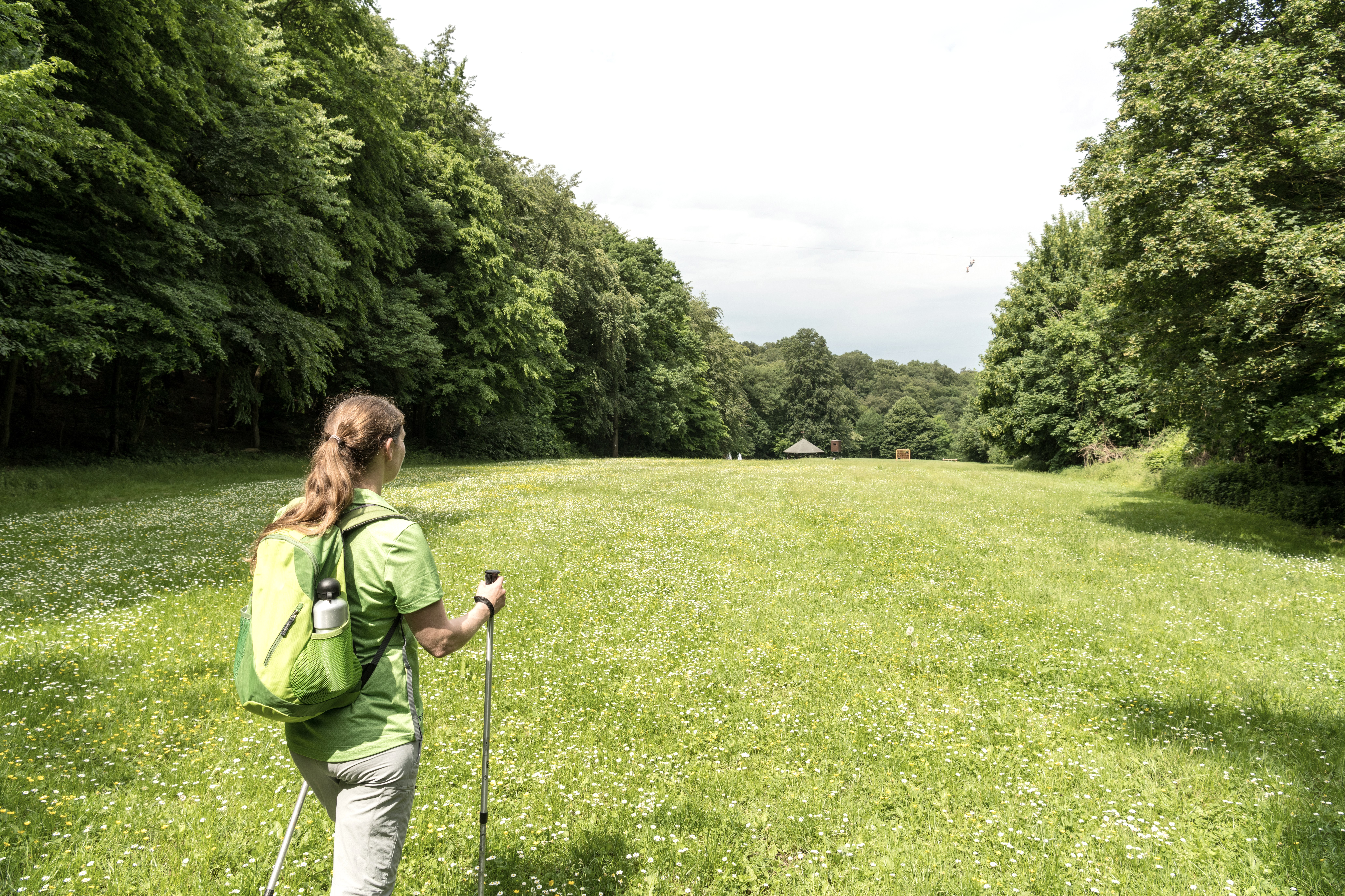 Après une pause silencieuse, nous conquérons lentement la montée du Karlskopf. Au-dessus de Bachem, la vue s'ouvre sur les vignobles en contrebas et sur la petite ville double animée de Bad Neuenahr-Ahrweiler. Mais tout de suite, nous nous enfonçons à nouveau dans la forêt de Bad Neuenahr. Après une courte descente, nous arrivons au Paradieswiese et au parc d'escalade en forêt. Ceux qui recherchent des sensations fortes peuvent se balancer à 30 m de hauteur à travers la prairie et revenir, accrochés à la corde de guidage avec leur propre harnais.