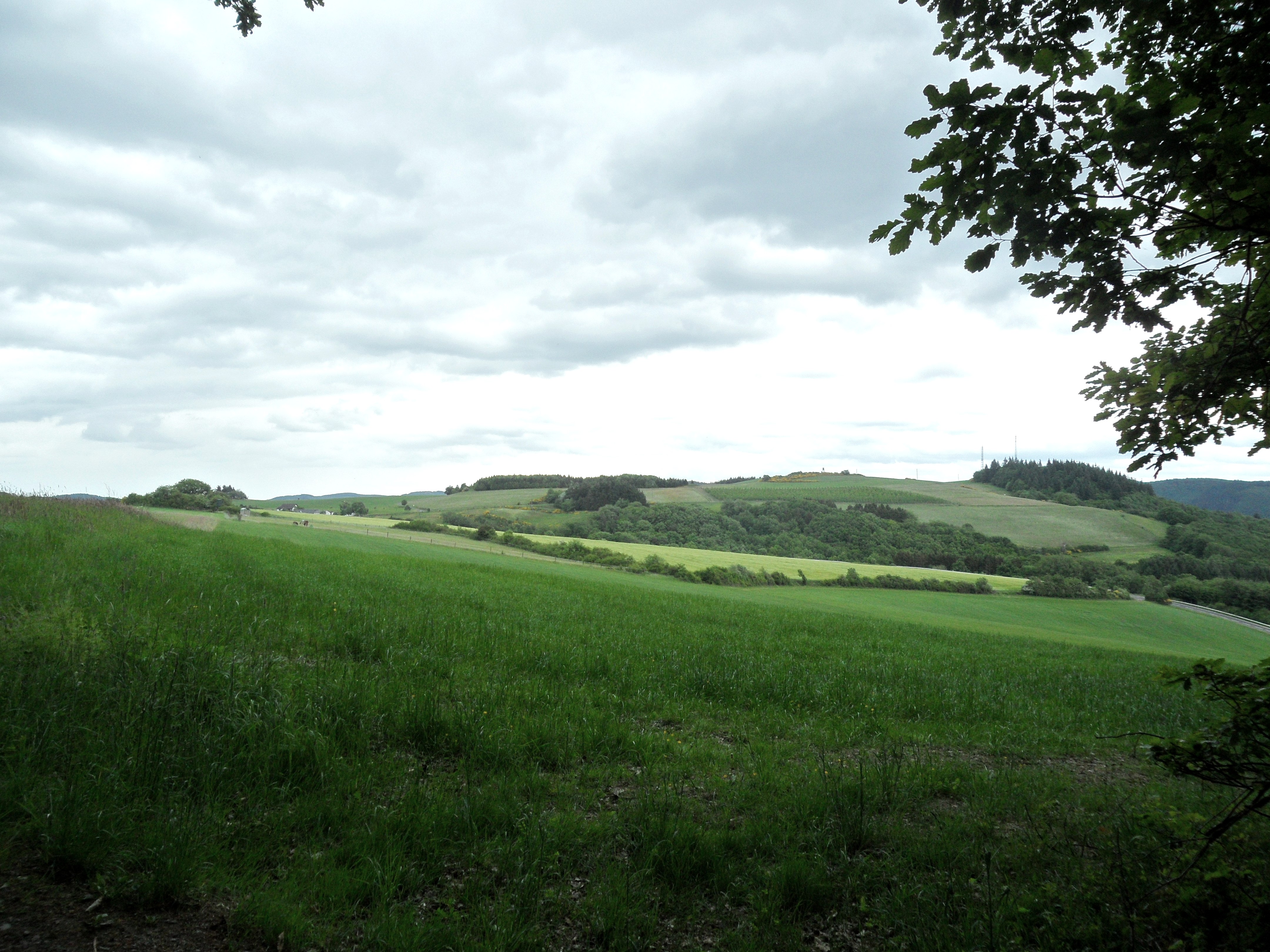 Nous la suivons alors sur 140 m vers la droite avant de tourner à gauche dans un chemin de prairie. Nous continuons en direction de la vallée, en passant devant la Haag. Arrivés sur le chemin transversal, nous continuons à droite en passant par des prairies et des haies d'aubépines autour du "Weilskopf" vers Harscheid. En chemin, on a à certains endroits une vue magnifique sur le paysage de l'Eifel et sur Schuld.