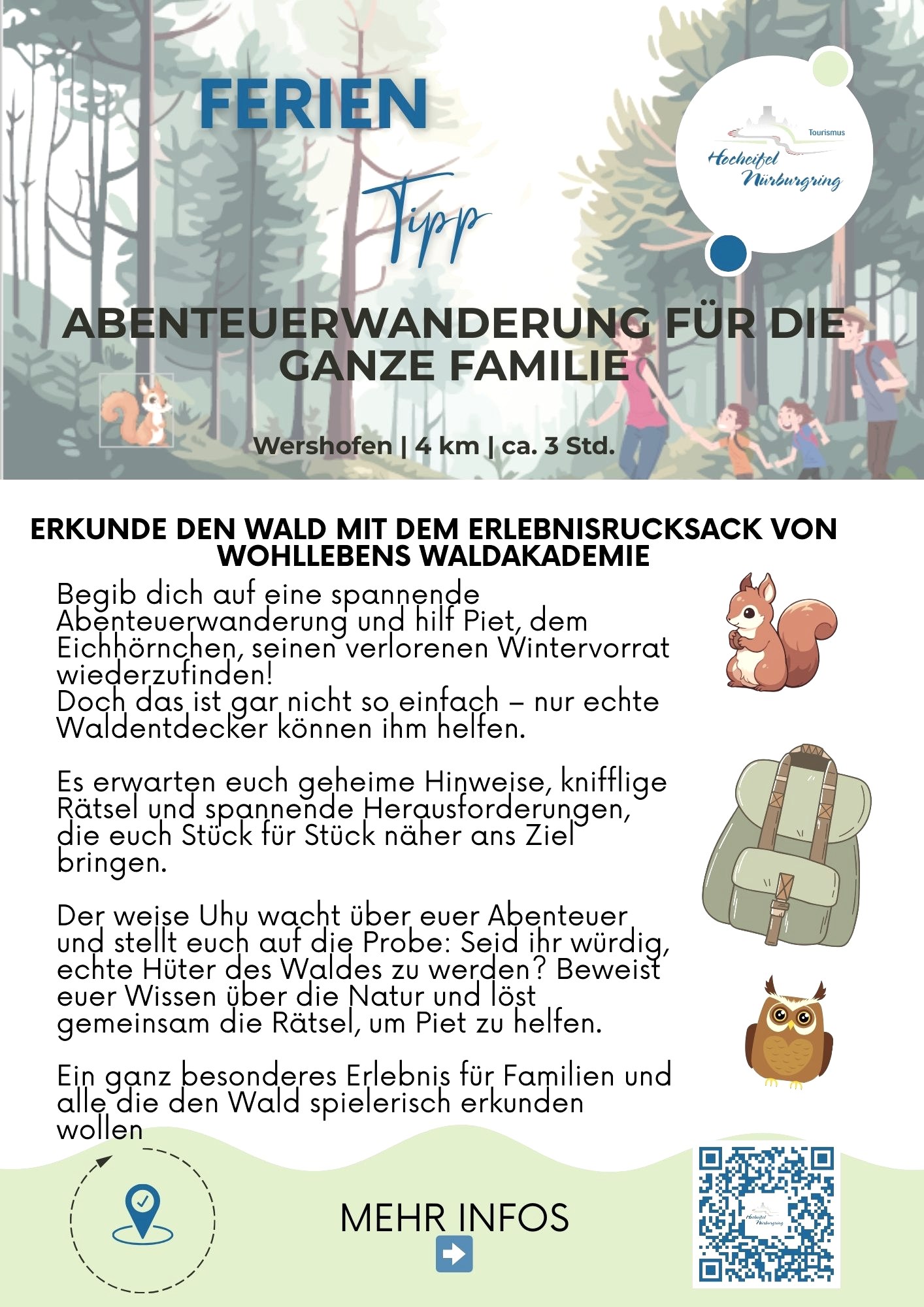 Begebt euch als Familie oder mit euren Freunden auf eine spannende 4,5 km lange Erlebniswanderung und helft gemeinsam Piet, dem Eichhörnchen, seinen verlorenen Wintervorrat wiederzufinden!