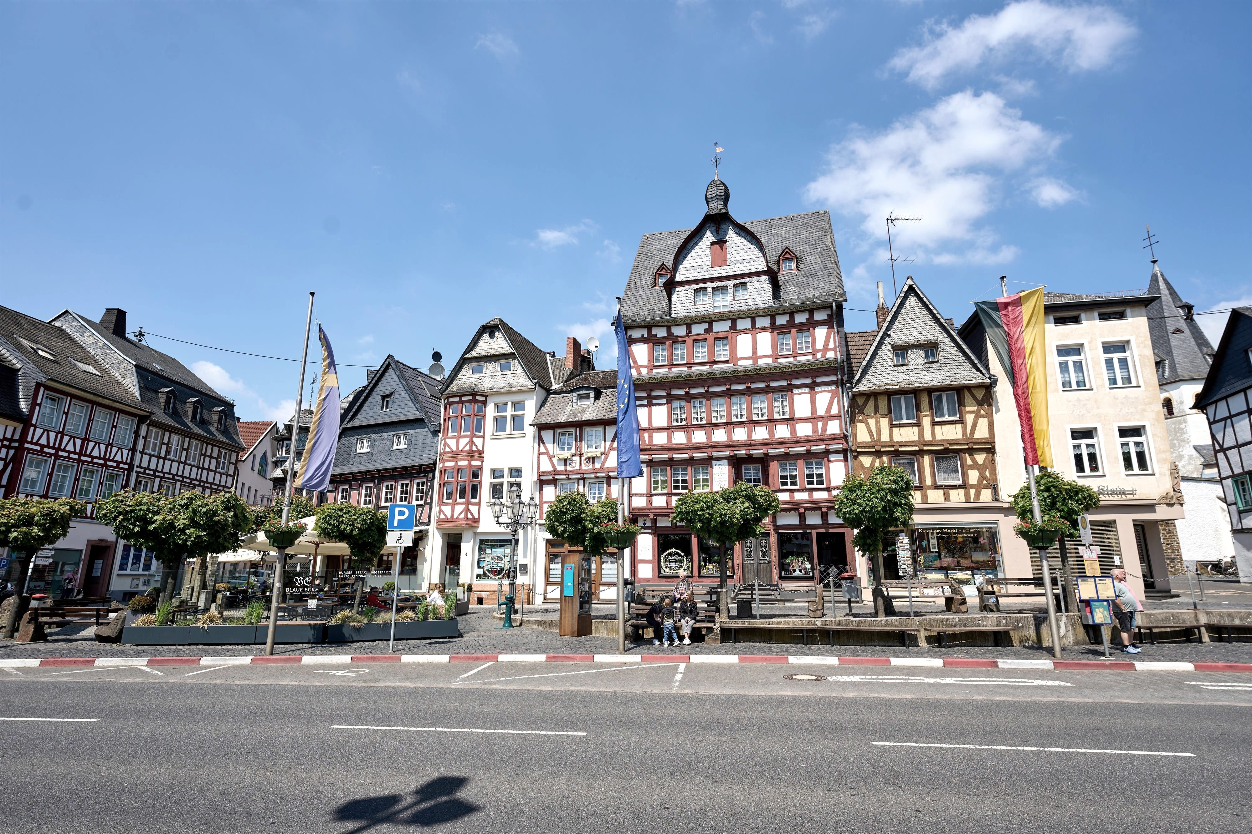 De pittoreske rij historische vakwerkhuizen op het marktplein van Adenau wordt beschouwd als het herkenningspunt van de stad.