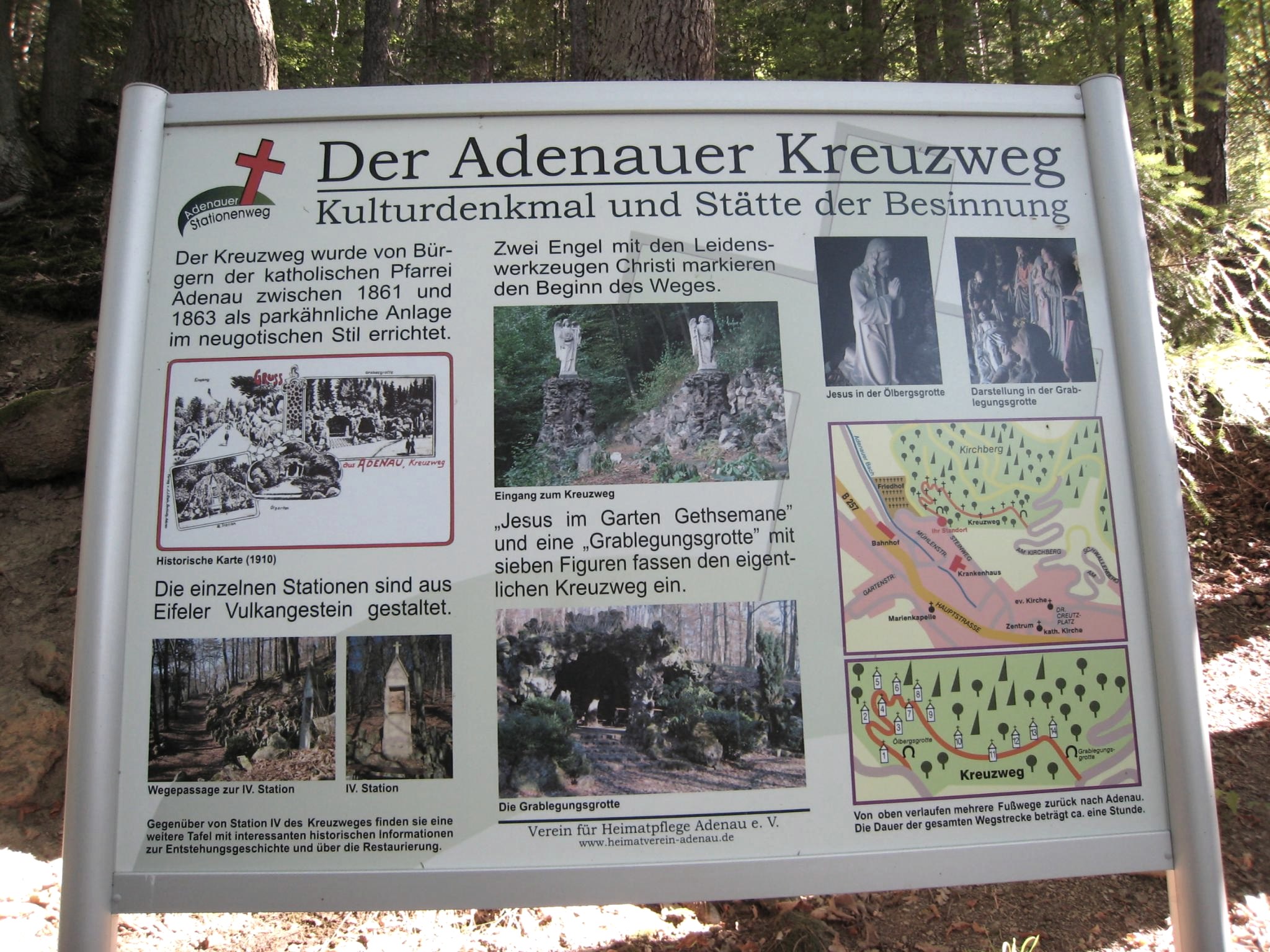 Vanaf hier loopt de route over het historische marktplein, door de Kollengasse, naar de kruiswegstaties, die nu meer dan 150 jaar oud zijn. Voorbij de 14 staties, omhoog naar de Grot van het Heilig Graf. Kort na de grot gaat u linksaf een korte klim omhoog naar een hoger gelegen pad, dat naar rechts in een boog om de Winsendell heen naar de Schwallenberg leidt. Daar heb je je eerste mooie uitzicht over Adenau en Wimbach tot aan Kottenborn. Vanaf hier is het slechts een korte, gemakkelijke wandeling over de Schwallenberg naar beneden naar de parkeerplaats voor wandelaars in Näsbach. Loop verder door de Näsbachstraße naar het restaurant "Gemütliche Ecke". Steek daar de hoofdweg over en loop verder langs de Adenauer Bach naar de Aldi supermarkt, waar je weer op de B 257 komt en na een paar meter op de Nürburgring-Nordschleife in Breidscheid aankomt. Volg de racebaan bergopwaarts naar Wehrseifen, een bekend toeschouwersgebied op de Nordschleife. Rijd door naar de kleine Wehrseifen-tunnel, die je onder het circuit brengt. Hier heb je een geweldig uitzicht over Adenau tot aan Reifferscheid. Dan gaat het omlaag naar Eckernbaum, omhoog via de Kallenbachstraße, langs het schoolcentrum en weer omlaag via een kort bospad naar het pad boven het voormalige zwembad. Het pad leidt tussen de tennisbaan en het Eifelstadion in de richting van Wimbach. Bij de schietbaan van BSC sla je rechtsaf, steek je de Wimbachstraße over en klim je links voor de elektriciteitscentrale steil omhoog het bos in. Na een korte klim buigt de route terug in de richting van Adenau. Via een mooi, rustig stijgend bospad, dat na korte tijd in een open weidegebied uitkomt, bereik je het oude sportveld op de Hirzenstein, dat nu als manege wordt gebruikt. Vanaf hier heb je weer een geweldig uitzicht over Adenau tot aan de Hohe Acht. Langs het nieuwbouwgebied van de Oberer Hirzenstein loopt de route nu naar beneden via de Wimbachstraße naar het centrum van Adenau of naar de parkeerplaats bij het startpunt.