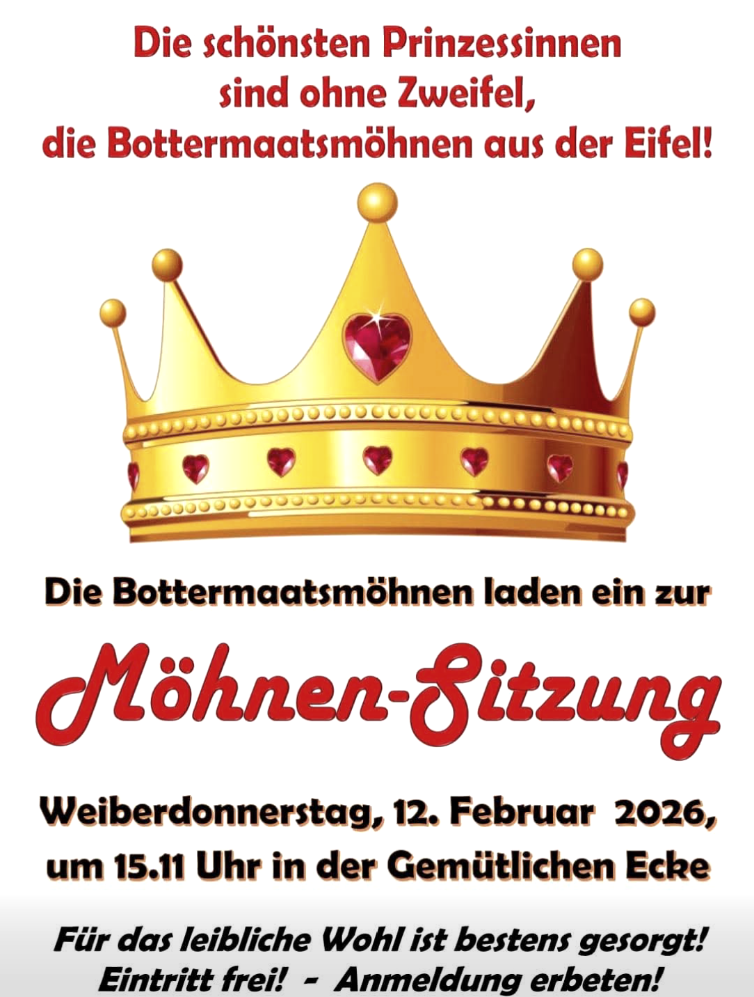 Möhnensitzung der Bottermaatsmöhnen in Adenau 12 feb. 2026 AdenauCarnaval evenement met grappige schetsen en muziek.mehr lesen Inhoud delen: