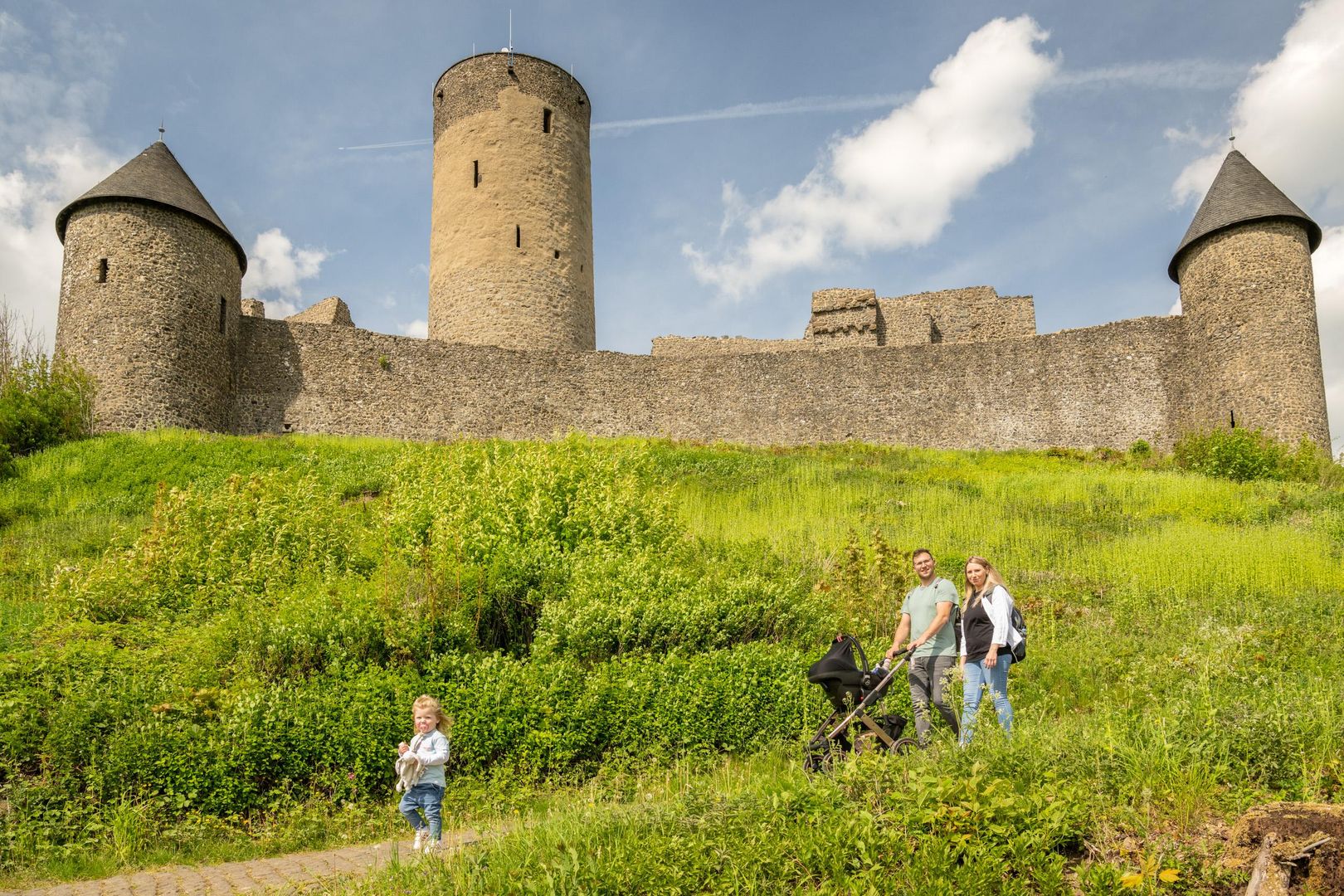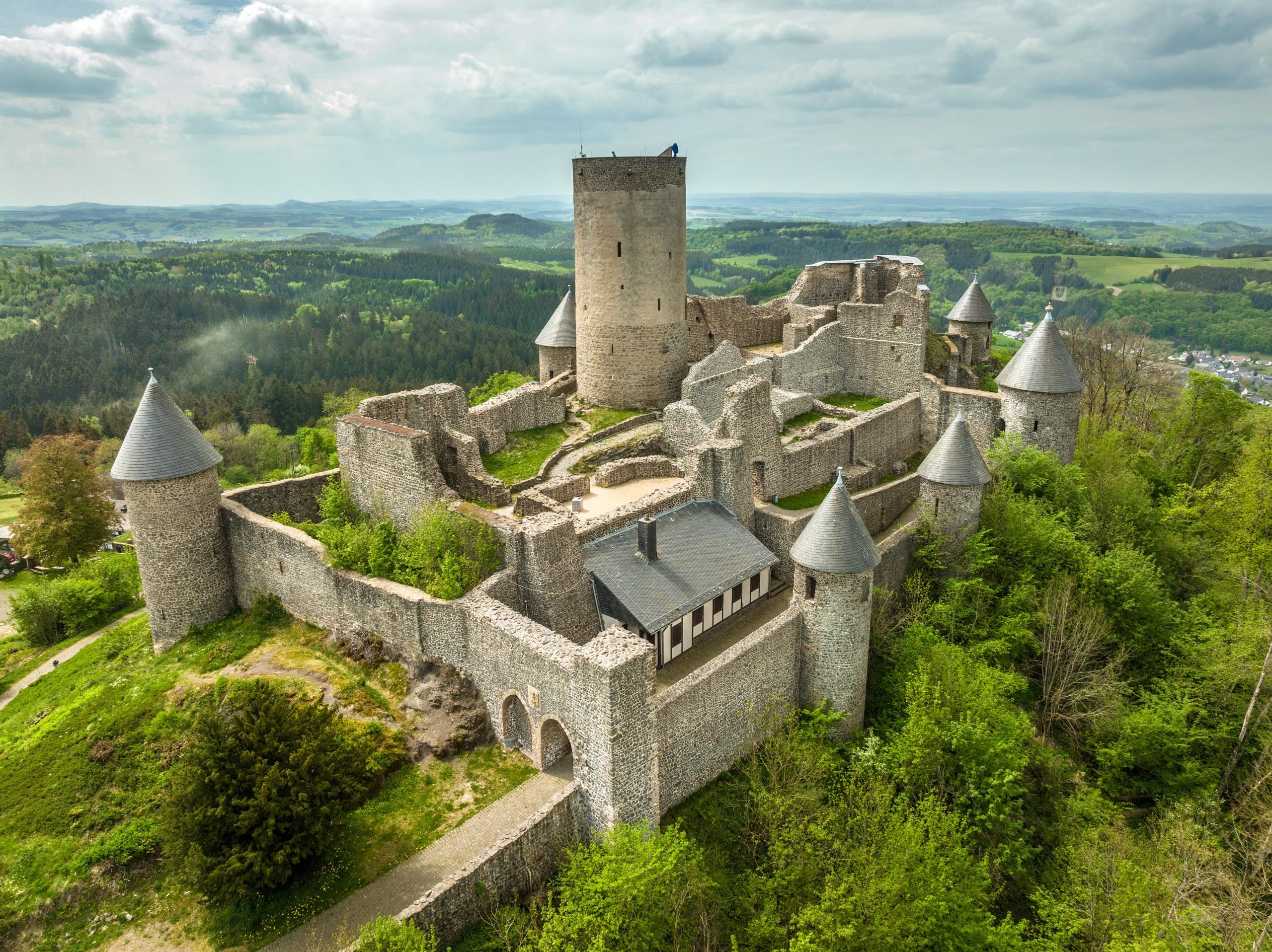 Die Nürburg wurde im 12. Jahrhundert von den Grafen von Are errichtet und über die Jahrhunderte mehrfach erweitert. Heute zeugen die mächtigen Mauern und der imposante Bergfried – auch „Grauer Turm“ genannt – von ihrer bewegten Vergangenheit. Der 20 Meter hohe Bergfried kann bestiegen werden und bietet eine spektakuläre Rundumsicht über die Hocheifel, die umliegenden Dörfer und die berühmte „Grüne Hölle“ – die Nordschleife des Nürburgrings.