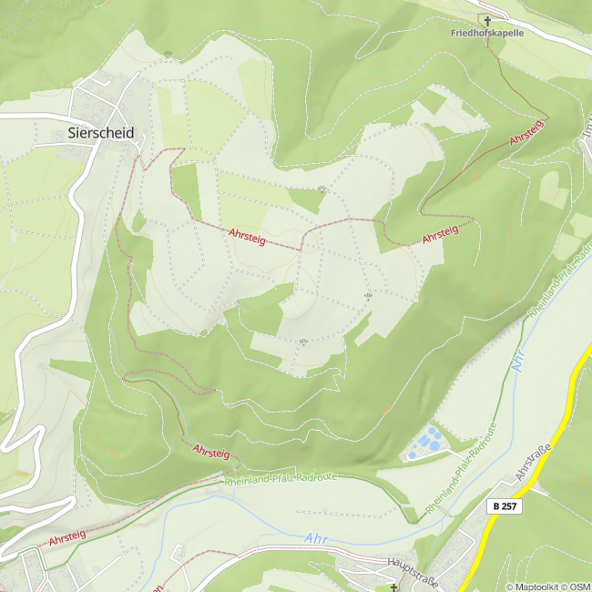 Ein Panoramaweg um die Dümpelhardt präsentiert die Vielfalt und Schönheit des Ahrgebirges, mit Blick auf die Nürburg. Der Rundweg hat eine Länge von knapp drei Kilometern und ist einfach zu gehen. Startpunkt ist am Wegekreuz oberhalb der Maternuskapelle in Sierscheid.