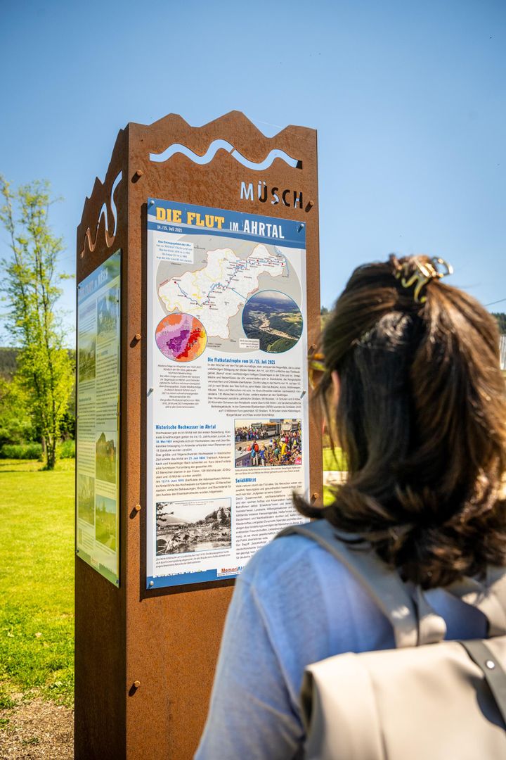 Mit insgesamt 34 Stelen - jede versehen mit vier großen Informationstafeln zum Flutereignis vom 14./15. Juli 2021, zum Wiederaufbau und zum Hochwasserschutz - wird dieser "Weg der Erinnerung" die gesamte Ahr von der Quelle bis zur Mündung durchziehen.