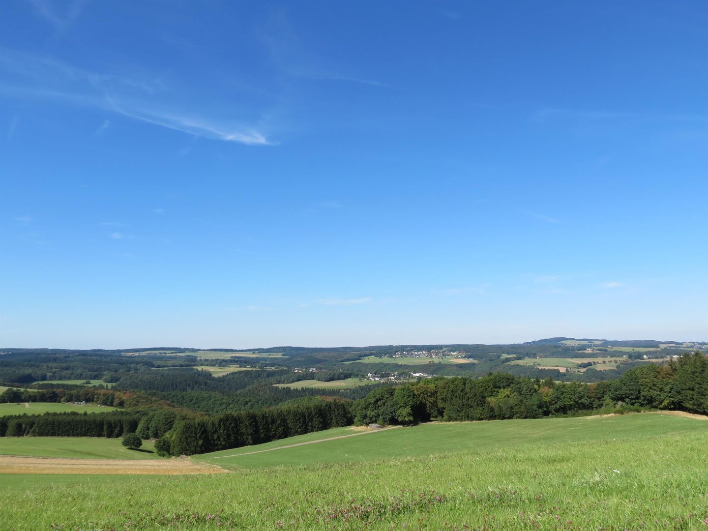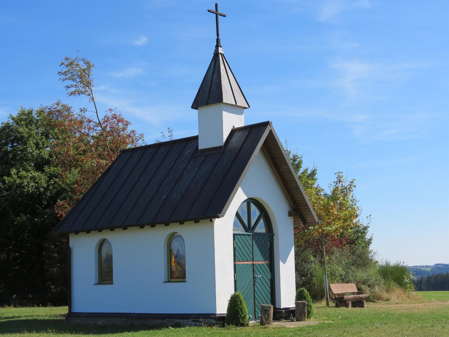 Vom Platz vor der Kapelle bietet sich eine traumhafte Fernsicht über die hügelige Hocheifel-Landschaft mit freiem Blick auf den markanten Aremberg, der als höchster Berg des Ahrgebirges imposant herausragt.
