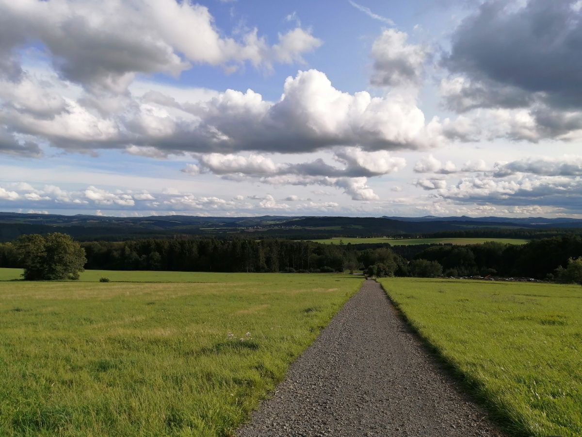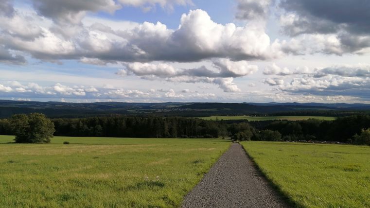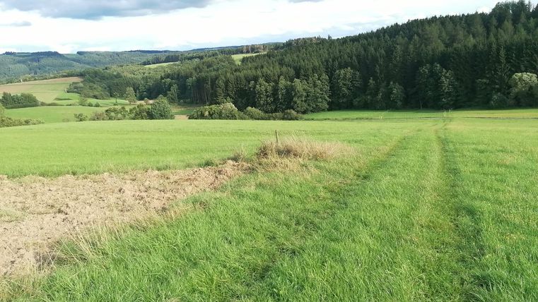 Zunächst fast schnurgeradeaus geht es kurze Zeit später wieder talwärts, vorbei an saftigen Wiesen und weiten Mais- und Weizenfeldern. Unterwegs beeindrucken immer wieder herrliche Fernsichten bis man wieder in einen verschlungenen Waldpfad abtaucht und gemächlich zum Ausgangspunkt nach Müsch zurückkehrt.