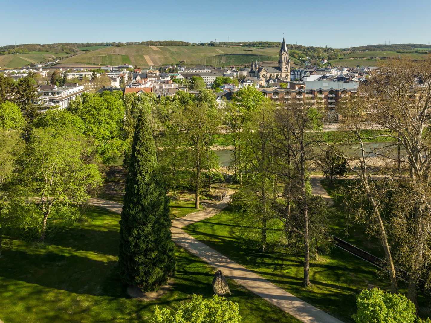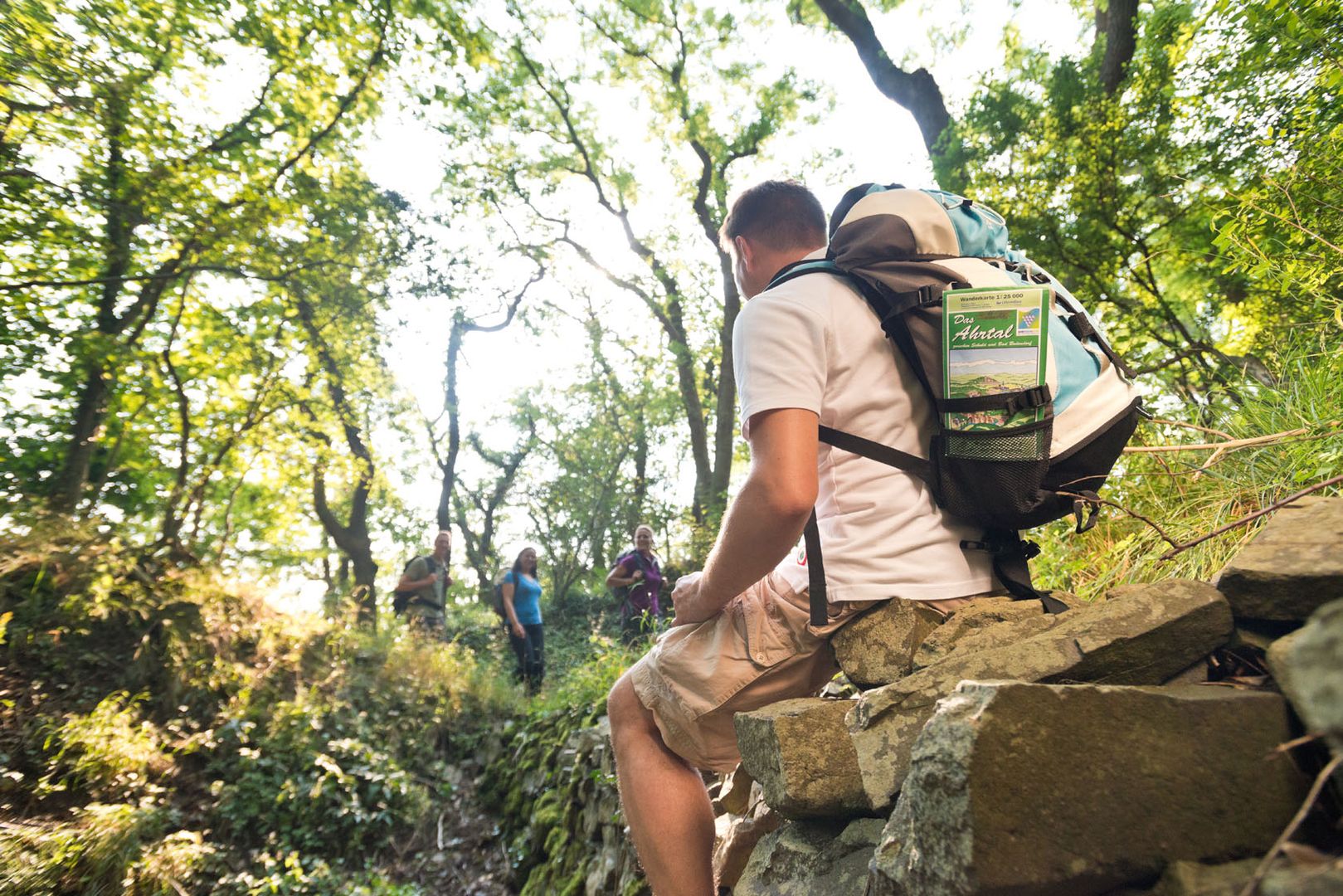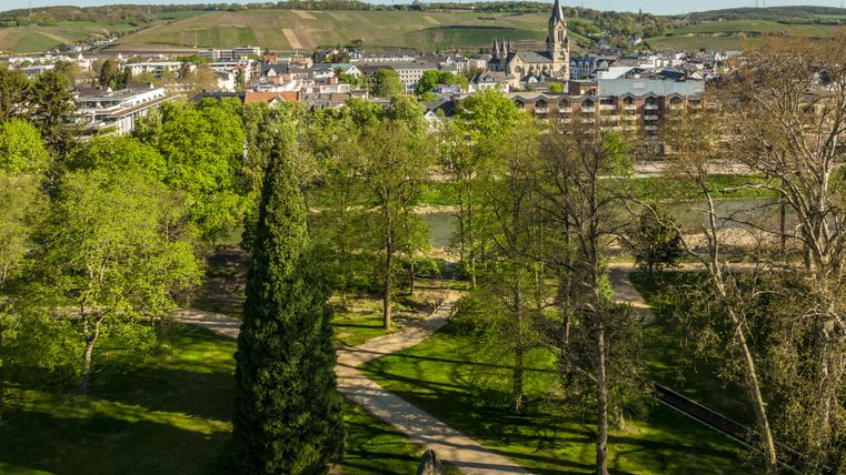 Nach einer stillen Einkehr erobern wir uns langsam den Anstieg auf den Karlskopf. Oberhalb von Bachem öffnet sich der Blick über die Weinberge hinunter auf das lebendige Doppelstädtchen Bad Neuenahr-Ahrweiler. Gleich geht es aber wieder hinein in den Bad Neuenahrer Wald. Nach kurzem Abstieg erreichen wir die Paradieswiese und den Waldkletterpark. Wer den besonderen Kick sucht, schwingt sich hier in 30 m Höhe einmal quer über die Wiese und zurück, nur im eigenen Gurt am Führungsseil hängend.