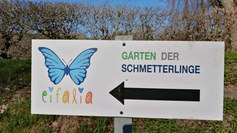 Weiter locker strampelnd unterwegs, weisen schon bald leuchtend bunte Schilder auf den Schmetterlingsgarten Eifalia in Ahrhütte hin, das Ziel unserer Entdecker-Tour. Nach einem Ausflug in die fantastische Welt der Schmetterlinge führt unser Weg wieder auf der gleichen Route zurück über Müsch nach Fuchshofen.