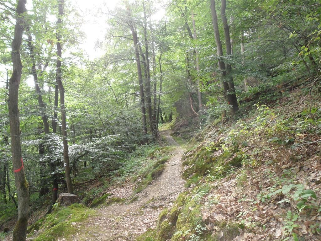 Nach ausgiebiger Rast setzen wir unsere Wanderung fort. Wir nehmen den Waldsteig unterhalb des Türmchens und steigen auf ihm durch den Wald talwärts.