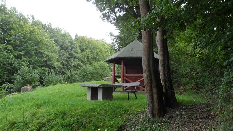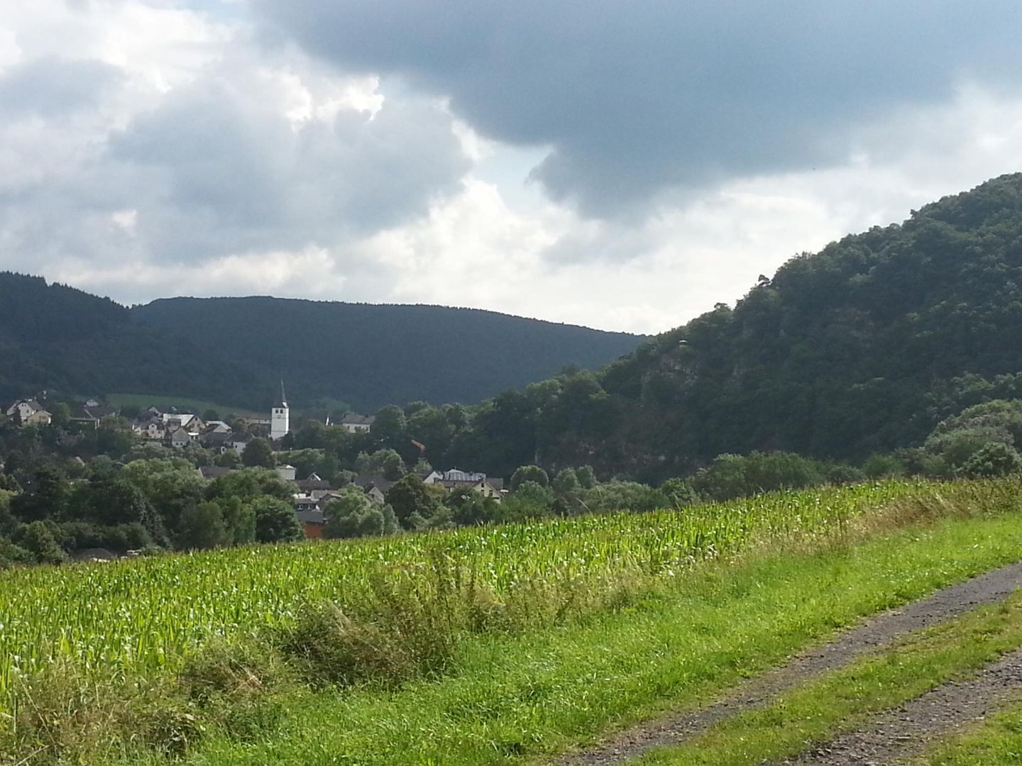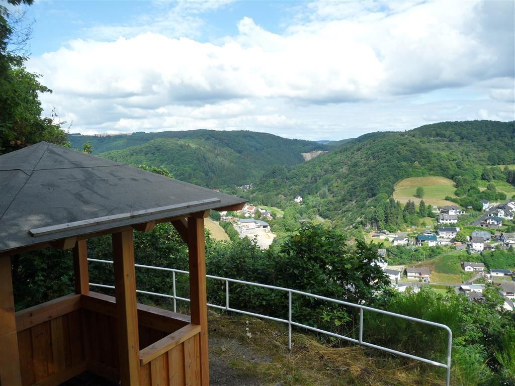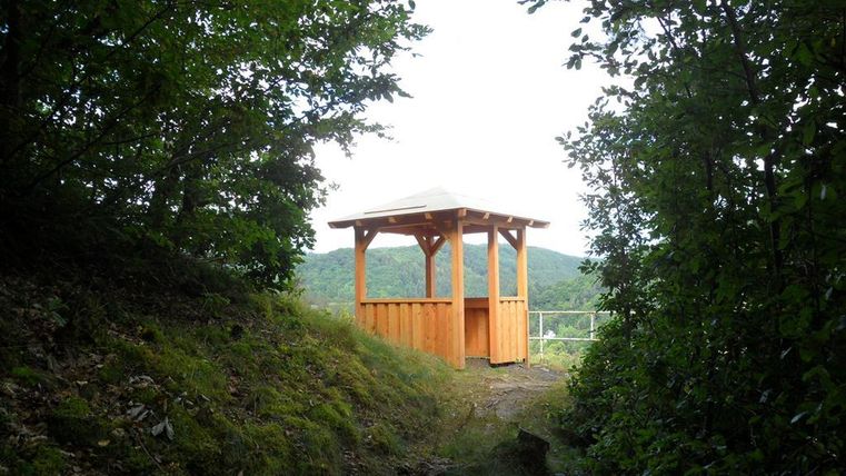 Vom 2. Aussichtpunkt geht es den Pfad weiter bergauf. Bevor wir oben ankommen, zweigt der Pfad nach links ab und trifft auf einen Waldweg, dem wir nach links, am Waldrand vorbei, folgen. Nach ca. 300 m treffen wir auf einen geteerten Wirtschaftsweg und sehen auf der linken Seite unser 3. Türmchen (Ahrblick) mit Blick auf den Ortsteil „Domhof“ von Schuld.