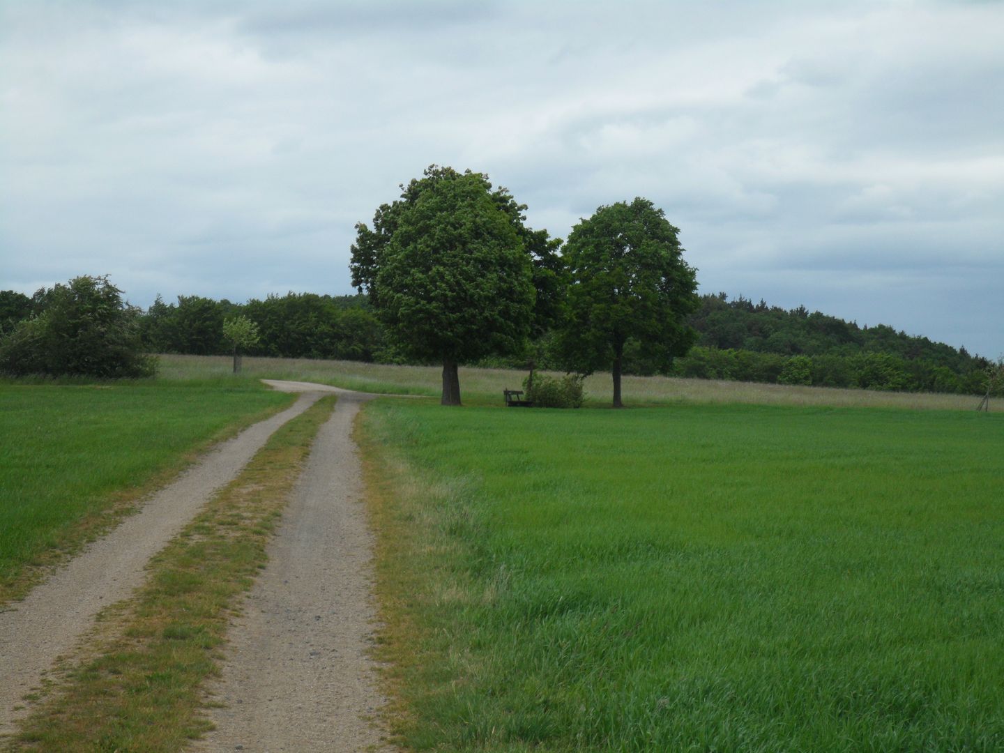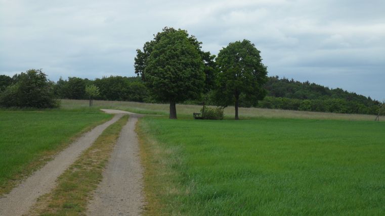 Am dritten Querweg biegen wir links ab und bleiben eine ganze Weile auf diesem Weg. Am Ende, bei der Wegegabelung, halten wir uns nach links . Nachdem wir eine Tannenschonung durchquert haben, geht es über den "Locherberg" an Wiesen und Weißdornhecken vorbei weiter. Am nächsten Weg biegen wir wieder nach links ab und durchqueren einen kleinen Taleinschnitt, dem wir - leicht ansteigend - weiter folgen. Der Weg führt uns durchs sogenannte „Eichholz“; wie der Name schon sagt, vorbei an Eichen und Buchenbeständen zurück Richtung Schuld.