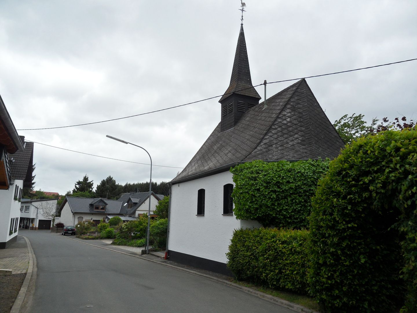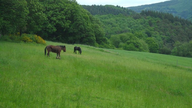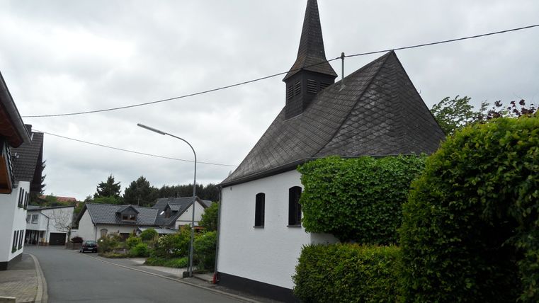 Unterhalb der ersten Häuser in Harscheid gehen wir nach links und treffen nach etwa 50 m auf die Kreisstraße, welcher wir nach rechts bis zur Kreuzung folgen. Dort gehen wir links weiter - an der Kapelle vorbei - ins Dorf und halten uns bei der nächsten Straßengabelung nach rechts. An der nächsten Wegkreuzung gehen wir rechts weiter an einer Scheune vorbei, verlassen nun die geteerten Straße und folgen dem Weg nach links hoch bis wir auf dem Bergkamm angekommen sind.