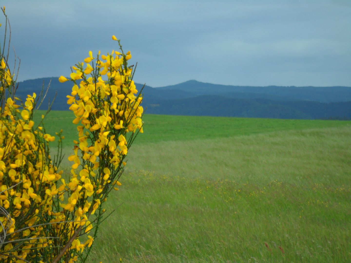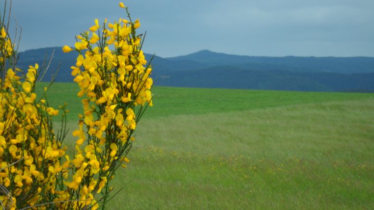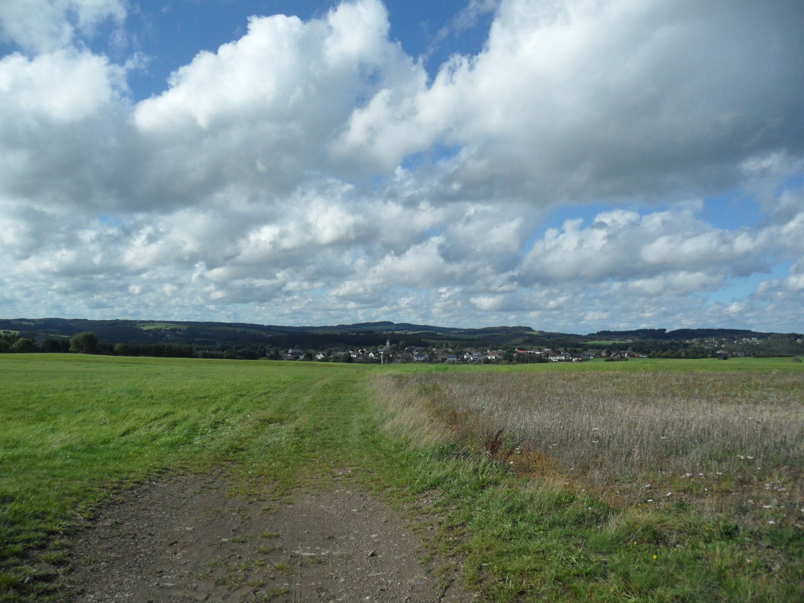 Von hier hat man eine rundum Aussicht: nördlich der Michelsberg, westlich der Aremberg und südlich die Hohe Acht. Wir folgen nun dem Wiesenweg geradeaus, abwärts Richtung Rupperath.