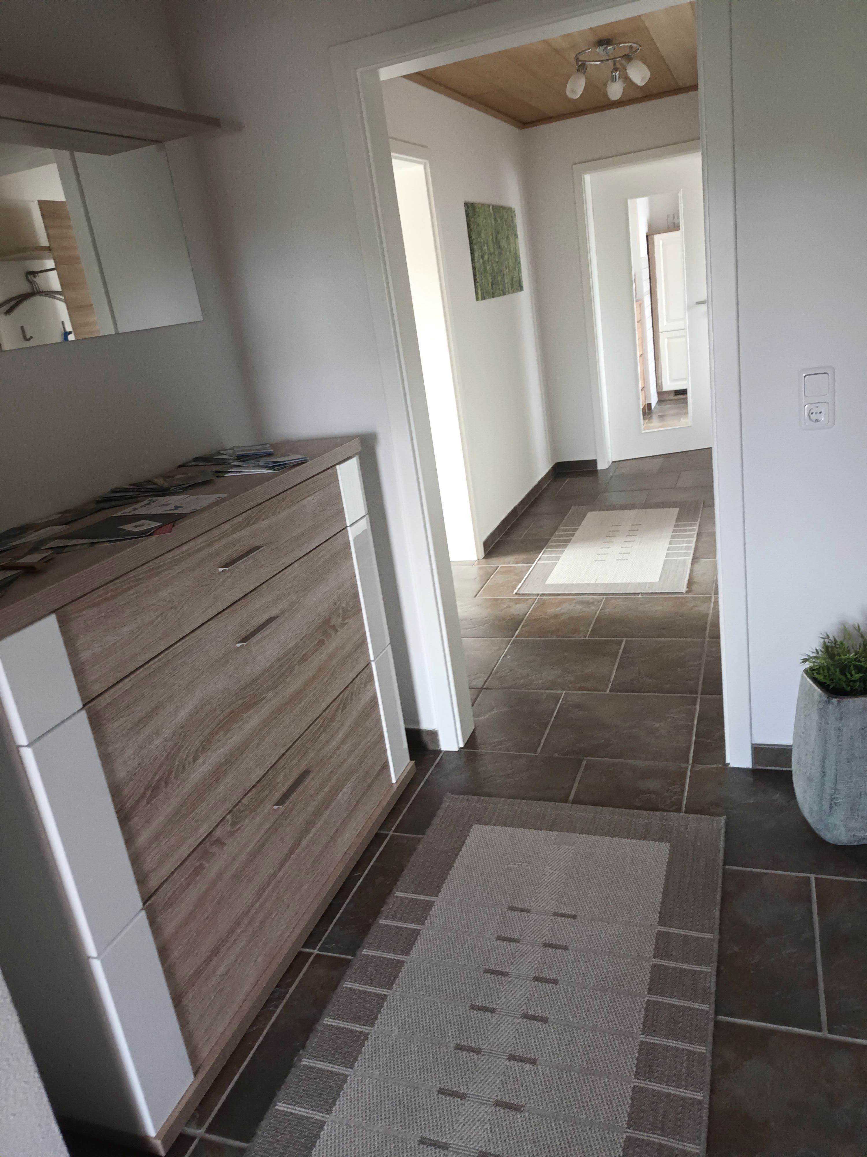 - Der geräumige Eingangsbereich ist mit einer großen Kommode, Garderobe und Spiegelschrank eingerichtet.