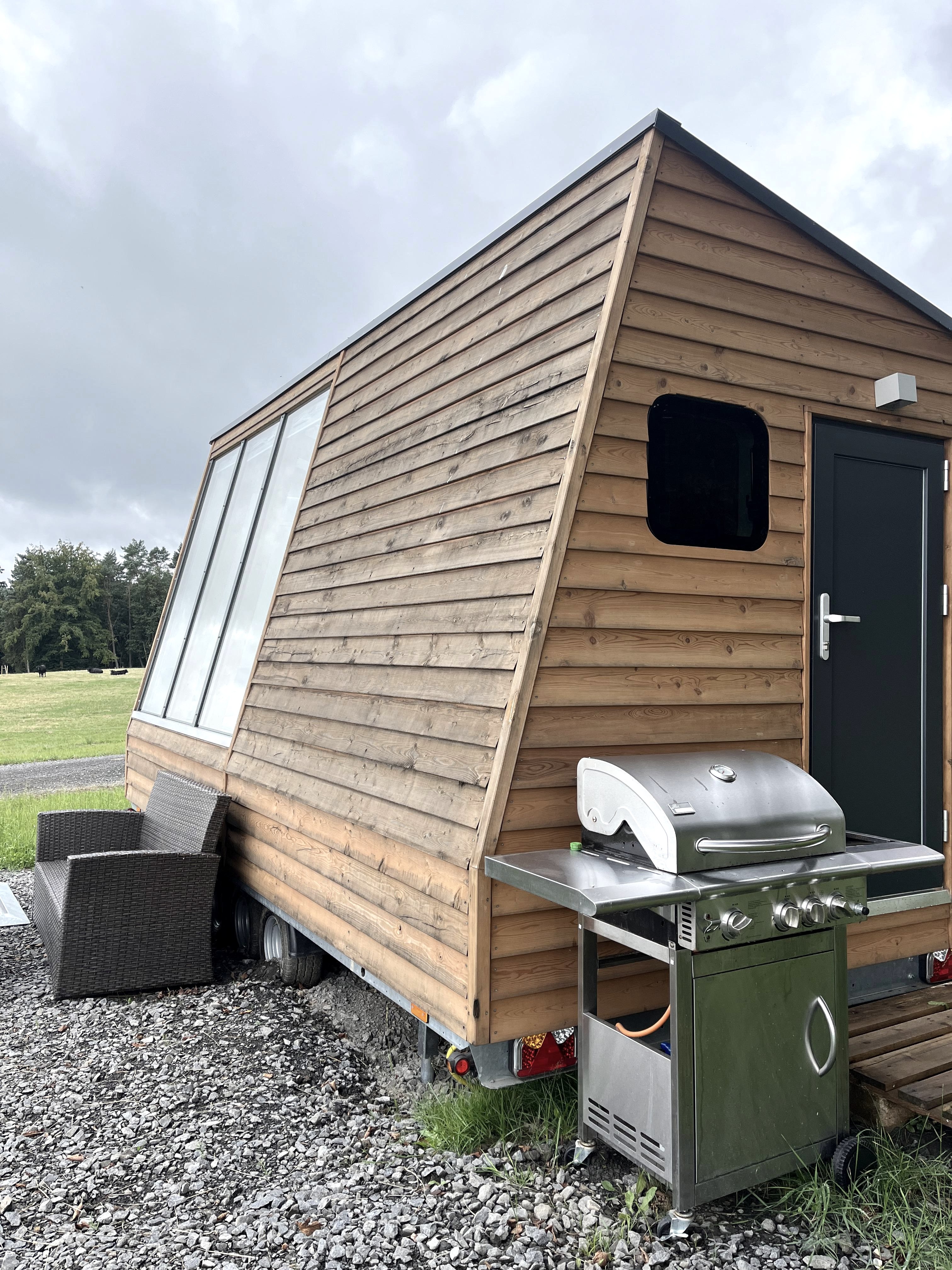 Im Außenbereich lädt eine gemütliche Sitzgarnitur mit Sonnenschirm zum Verweilen ein, während man den herrlichen Ausblick genießt. Neben dem Tiny House befindet sich ein Grill, ideal für gesellige Abende unter freiem Himmel.