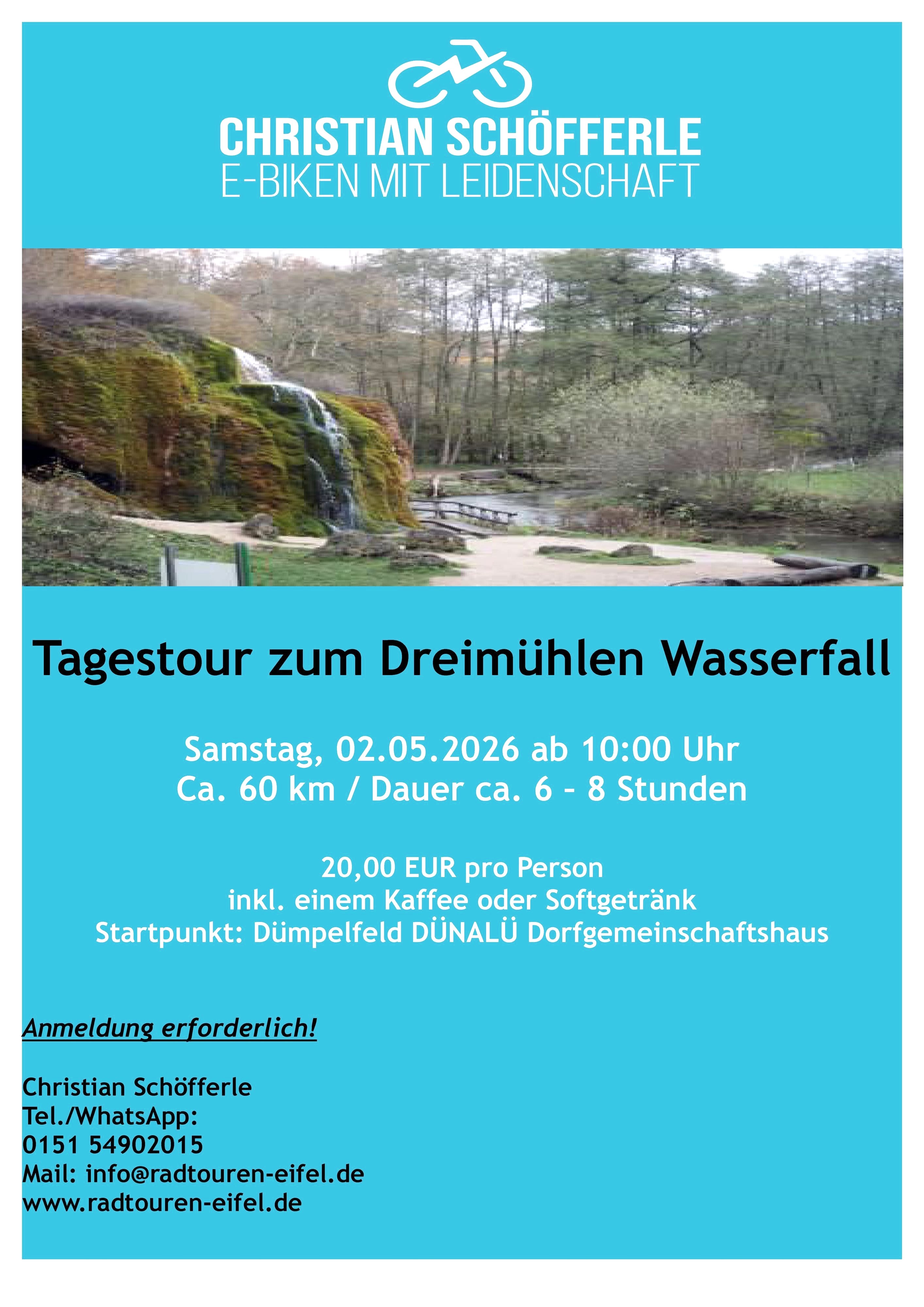 Geführte Tagestour von Dümpelfeld zum Wasserfall Dreimühlen nach Nohn. Diese Tagestour ist für jeden normal konditionierten Radler kein Problem. Die Tour hat eine Länge von ca. 60 km und dauert ca. 6 - 8 Stunden. In der Nähe des Wasserfalls gibt es ein kleines Café, mit Einkehr. Nach der Pause und Besichtigung des Wasserfalls, geht es wieder nach Dümpelfeld zurück. Im Preis von 20,00 Euro pro Person ist ein Kaffee oder ein Softgetränk enthalten.