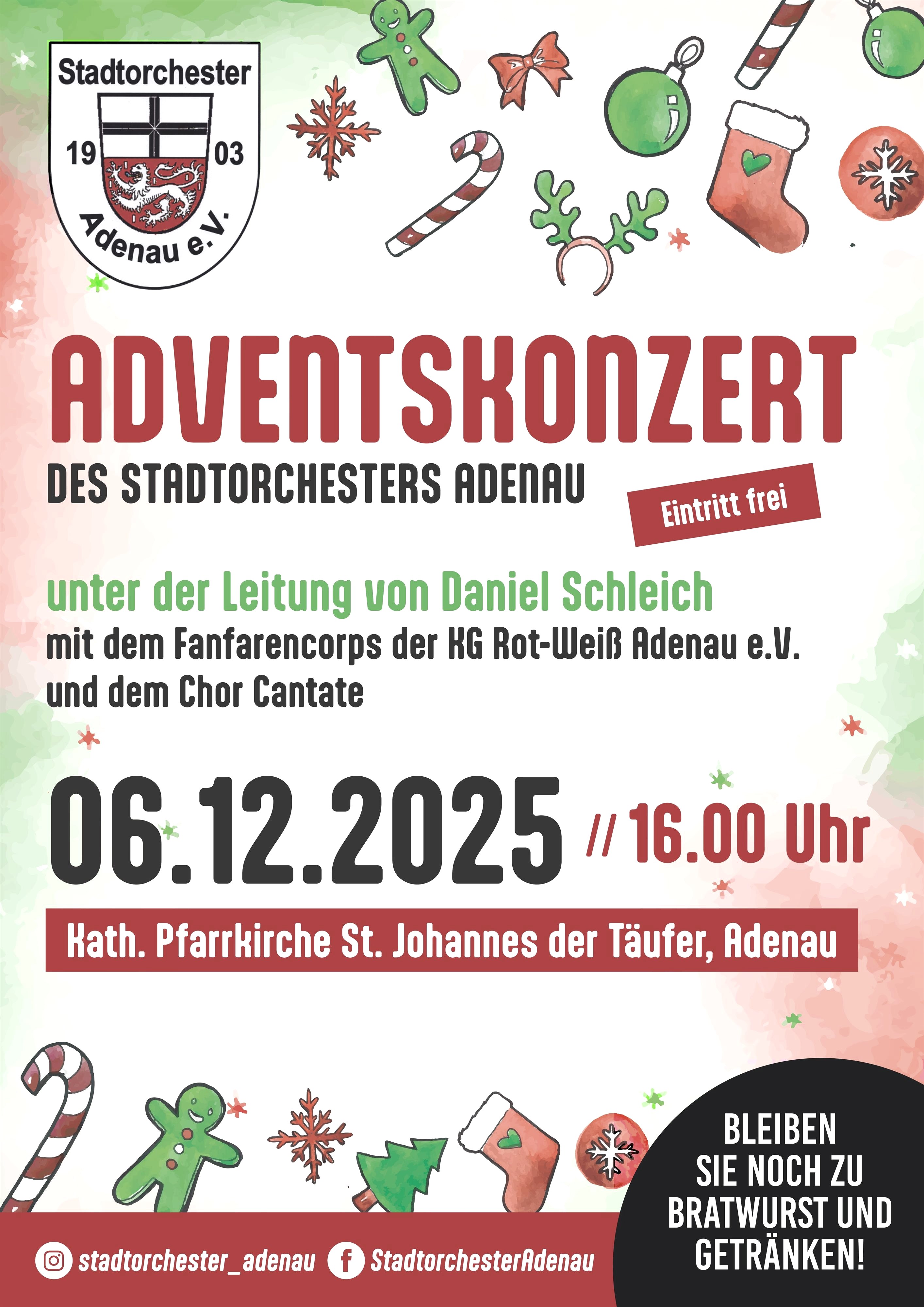 Das Stadtorchester Adenau wird in diesem Jahr am Samstag, den 6. Dezember 2025 um 16:00 Uhr in der Pfarrkirche St. Johannes der Täufer in Adenau unter der Leitung von Daniel Schleich sein Adventskonzert präsentieren. Wer sich musikalisch auf die Advents- und Weihnachtstage einstimmen möchte, ist hierzu herzlich eingeladen. Das Stadtorchester wird unterstützt vom Fanfarencorps der KG Rot-Weiß Adenau e.v. und dem Chor Cantare und freut sich auf viele Zuhörer.