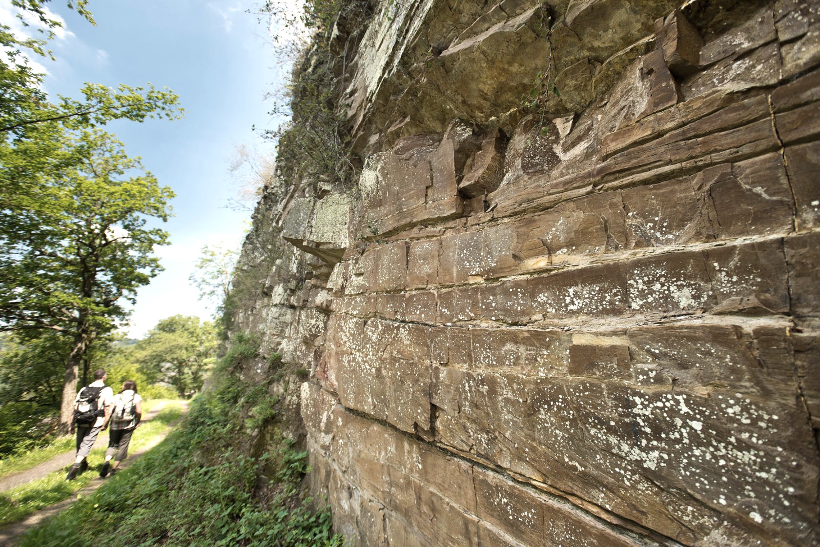 Bevor das Etappenziel erreicht wird, geht es über Forstwege hinauf zu dem beeindruckenden Felsmassiv der Spicher Ley. Von dort aus erschließen sich imposante Blicke auf das Ahrtal. Ein letztes Mal steigt die Route an und führt nach Querung des Holzseifenbachs, durch Wälder und Wiesen, hinab nach Insul.