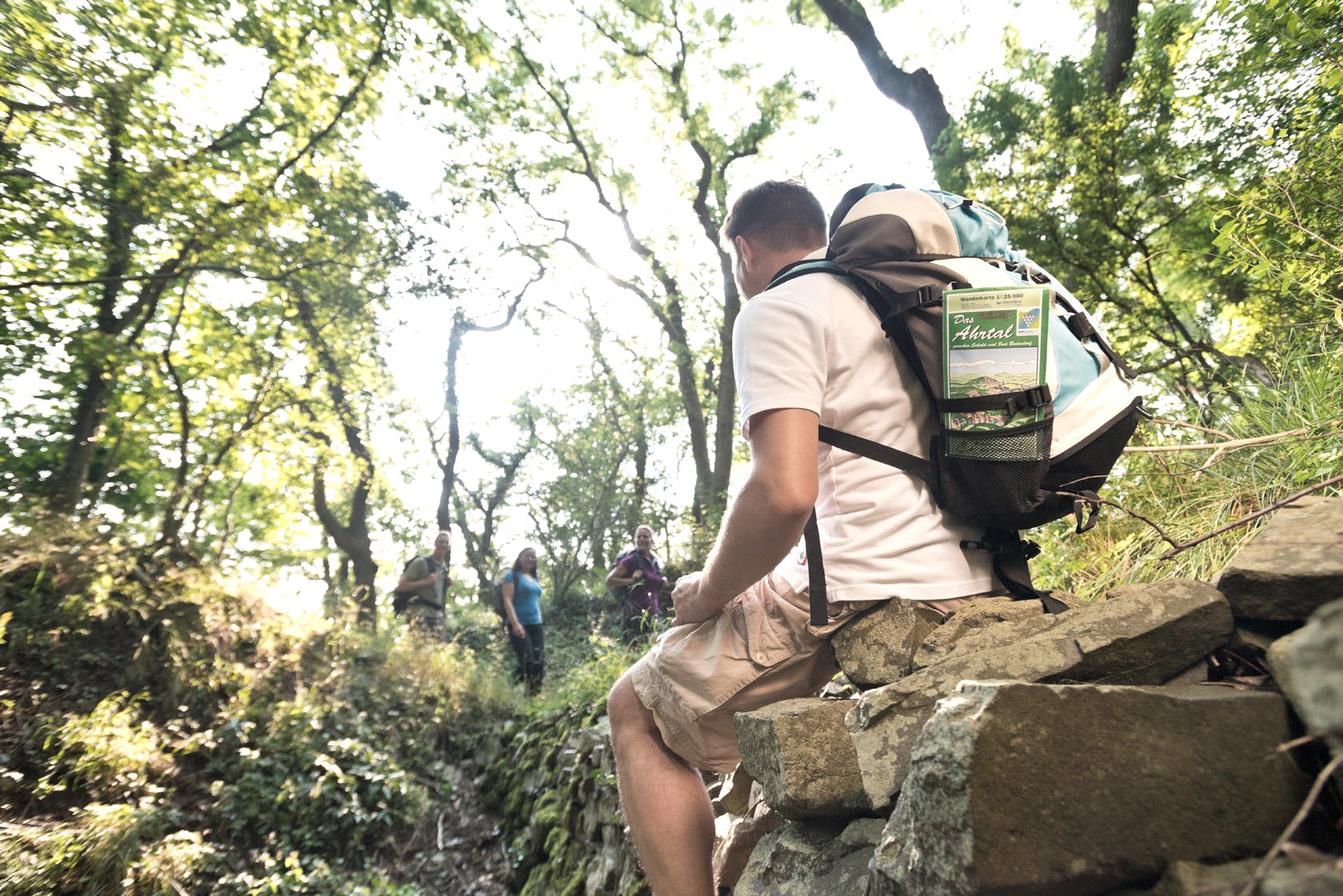 Nach einer stillen Einkehr erobern wir uns langsam den Anstieg auf den Karlskopf. Oberhalb von Bachem öffnet sich der Blick über die Weinberge hinunter auf das lebendige Doppelstädtchen Bad Neuenahr-Ahrweiler. Gleich geht es aber wieder hinein in den Bad Neuenahrer Wald. Nach kurzem Abstieg erreichen wir die Paradieswiese und den Waldkletterpark. Wer den besonderen Kick sucht, schwingt sich hier in 30 m Höhe einmal quer über die Wiese und zurück, nur im eigenen Gurt am Führungsseil hängend.