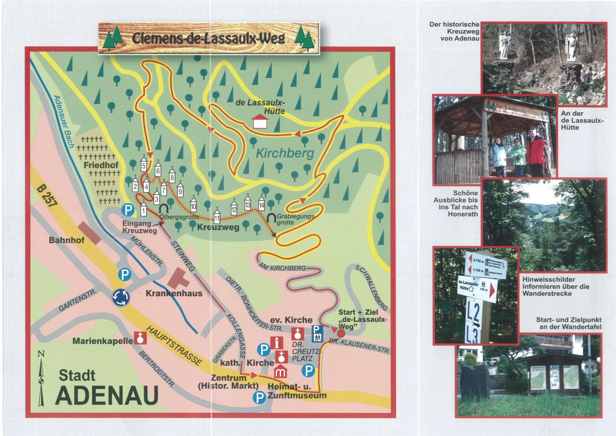 Start der Tour ist am Wanderparktplatz "Dr.-Creutz-Platz" in Adenau. Über den Kirchberg erreicht man nach ca. 2 km den mit 445 Hm höchsten Punkt der Tour, die "De-Lassaulx-Hütte". Bei einer kurzen Rast bietet sich ein wunderschöner Ausblick über die Stadt Adenau und in Richtung Honerath. Weiter geht es über einen Teilabschnitt des historischen Kreuzwegs. Durch die malerische Kollengasse führt die Route weiter zum historischen Marktplatz mit seinen bunten Fachwerkhäusern, bevor man vorbei am Zunftbrunnen wieder zum Ausgangspunkt zurückkehrt. Die Strecke kann auch beginnend am historischen Marktplatz durch die Kollengasse über den Kreuzweg in entgegengesetzter Richtung gewandert werden. Die Route ist durchgängig mit dem Wegenamen ausgeschildert.