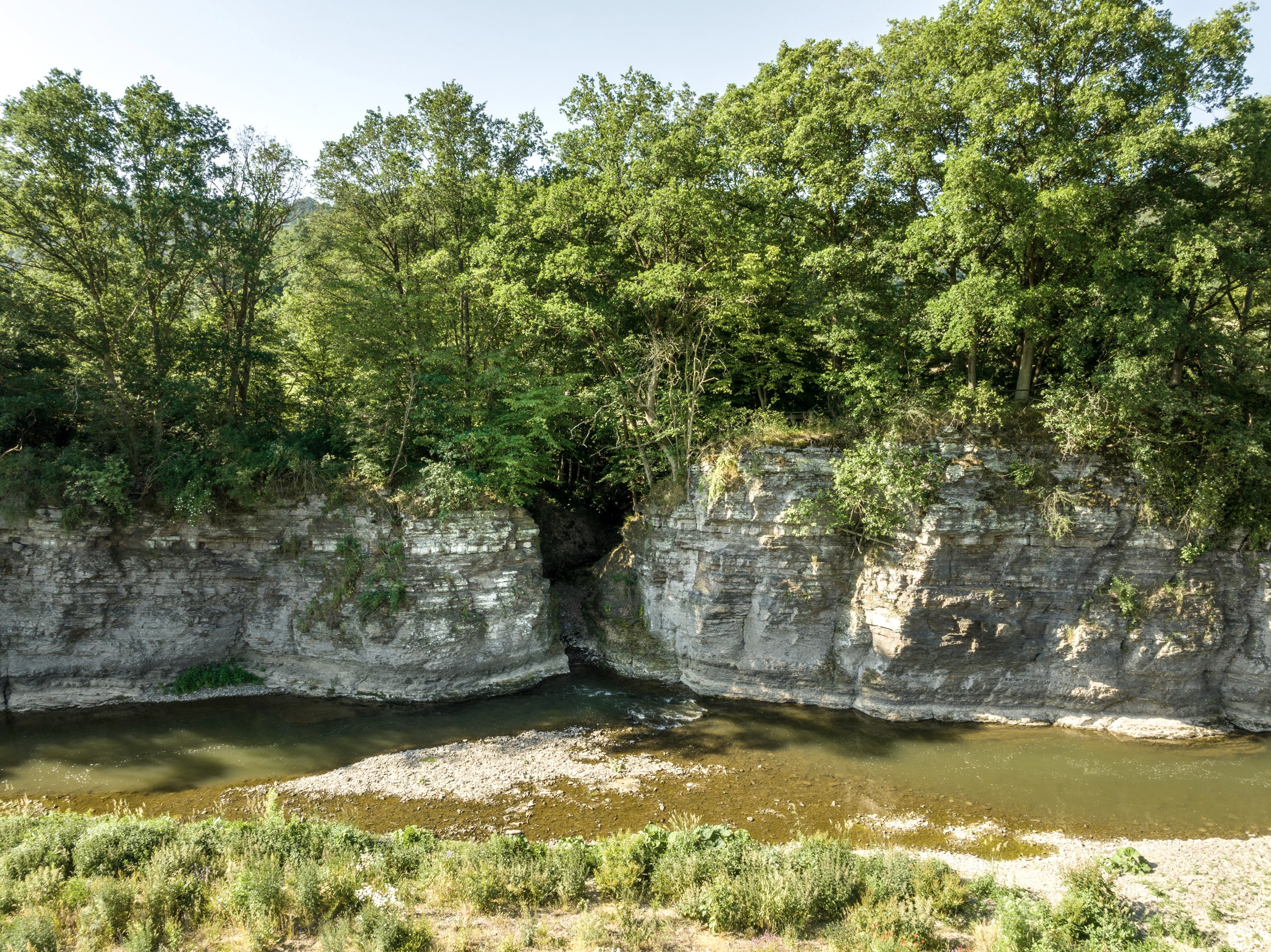 Ein weiteres Highlight der Tour erwartet den Wanderer ein Stück weiter: Das Naturdenkmal "Prümer Tor", eine beeindruckende Felsspalte, die sich in Millionen Jahren durch die Kraft des Wassers gebildet hat. Es lädt zu einer Pause ein und der Möglichkeit der Erfrischung durch ein Fußbad in der Ahr. Folgt man dem AhrSteig weiter, gelangt man wieder zurück zum Ausgangspunkt Schuld.