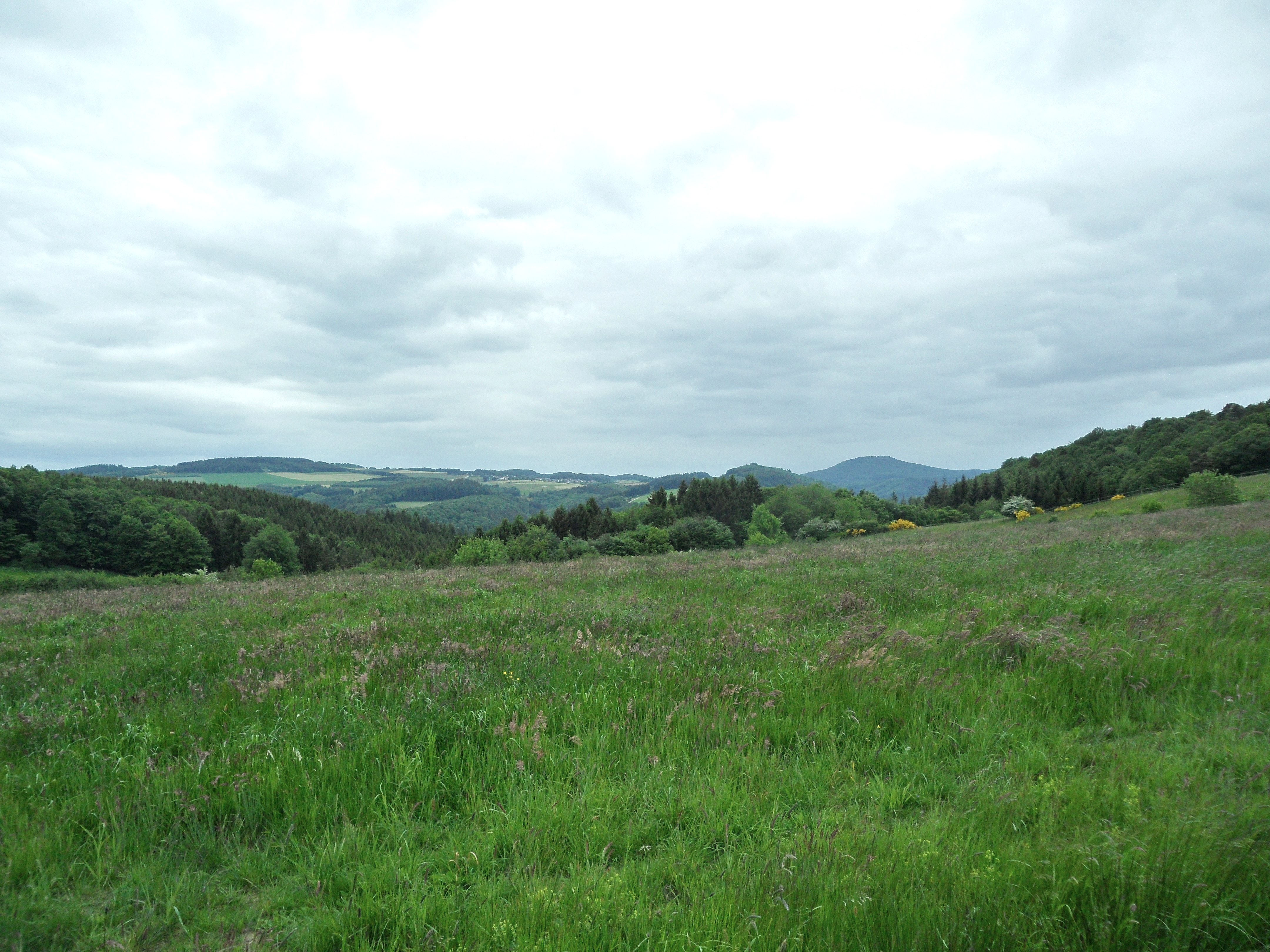 Auf der rechten Seite ist die „Dümpelhard“ mit seinen zwei Sendetürmen zu sehen. Während wir nun weiter in Richtung Sierscheid wandern kann man auch rechts in der Ferne die Nürburg gut erkennen.